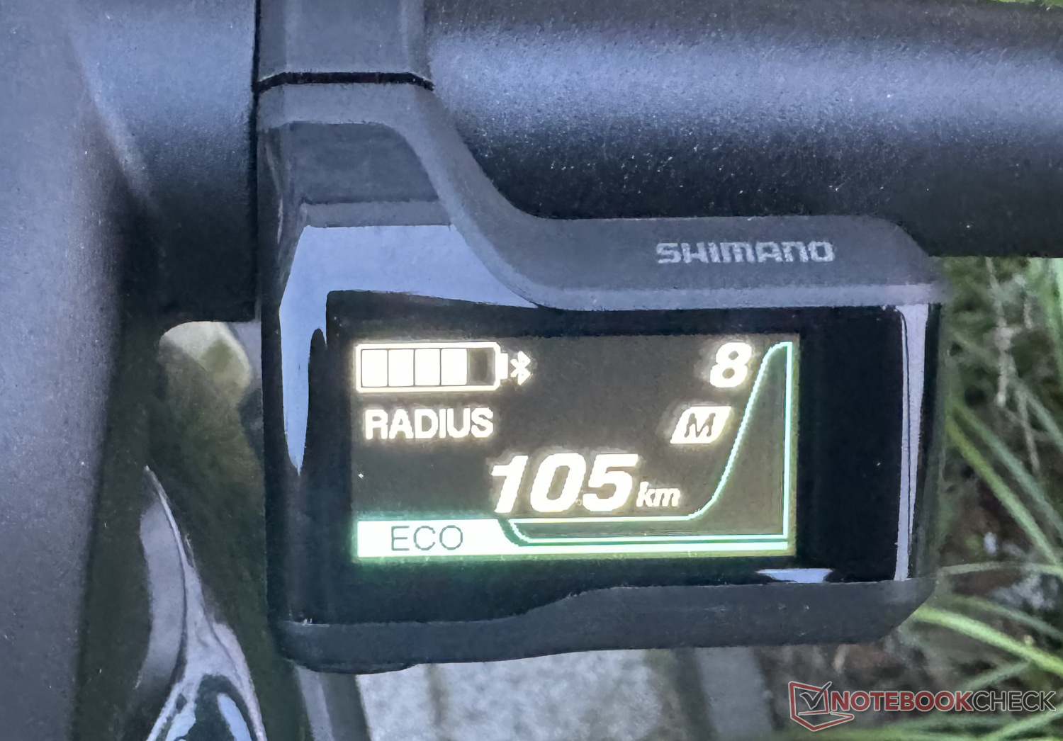 Das Display am Lenker, das über viele Dinge wie den Modus, die Unterstützung, die Triplänge, die Geschwindigkeit sowie den eingelegten Gang informiert, zeigt auch die Restreichweite an. Mit vollgeladenem Akku liegt diese laut Anzeige im Eco-Modus anfangs bei 175 km (Trail: 84 km / Boost: 64 km).
