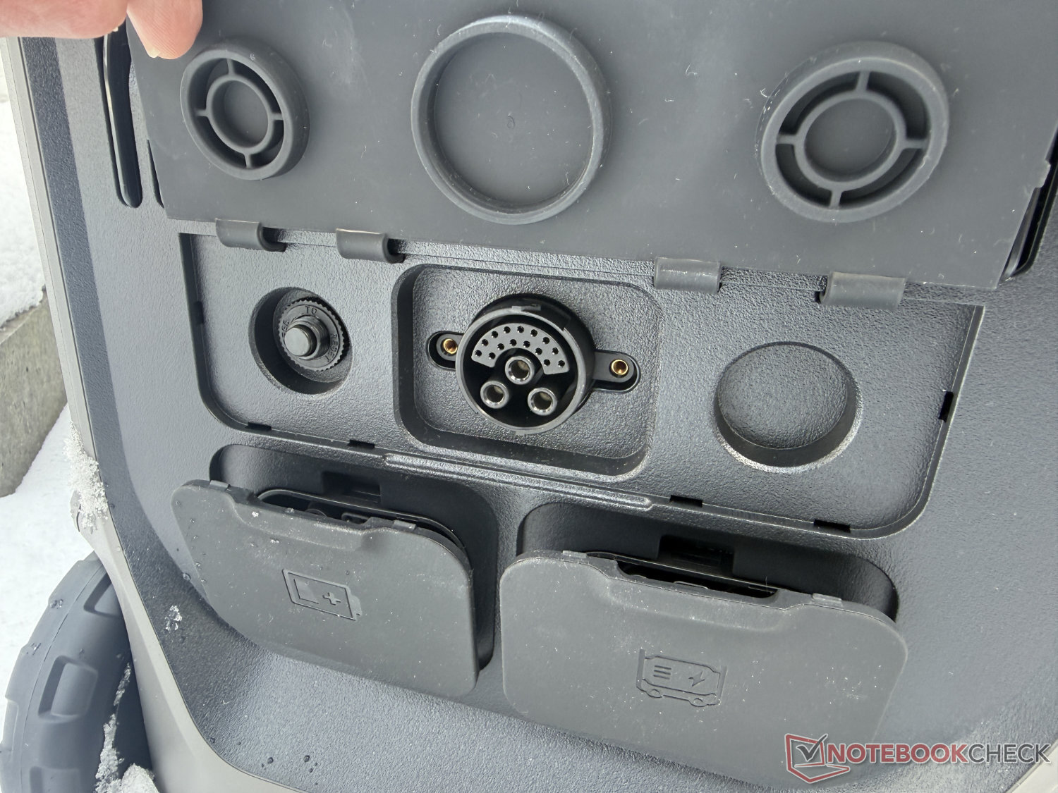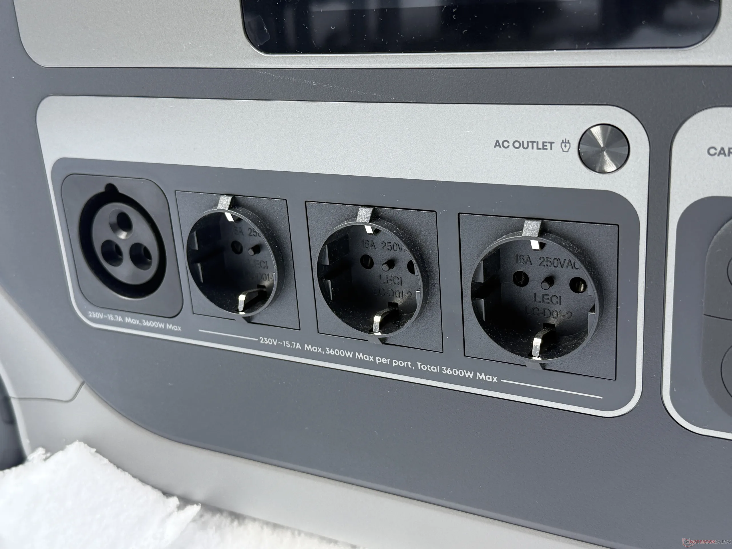 Für die 230-V-Versorgung stehen nicht nur drei AC-Steckdosen, sondern auch ein CEE-Anschluss (beispielsweise für die Landstromversorgung von Wohnmobilen) zur Verfügung. Dazu kommen je zweimal USB-C (max. 100 W) und USB-A (max. 12 W) sowie die übliche 12-V-Kfz-Steckdose.