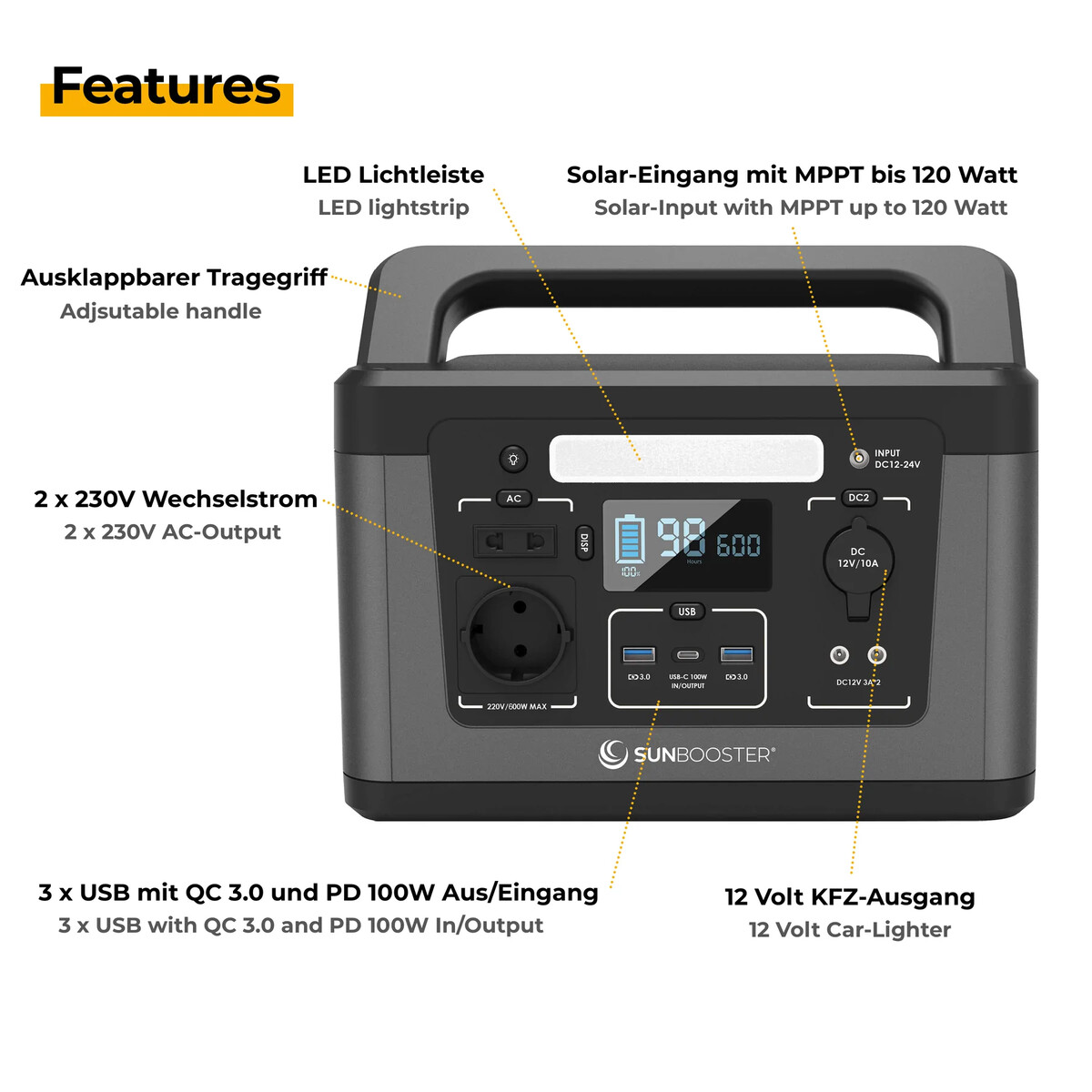 Geladen werden kann die Powerstation neben dem Stromnetz auch über das im Set beiliegende Sunbooster 120W. Hierbei handelt es sich um ein bis zu 120 Watt leistendes Solarpanel aus hocheffizienten Sunpower Solarzellen mit 22,4 Prozent Effizienz. Zum Laden steht das Panel auf zwei ausklappbaren Füßen, beim Transport ist es dank Faltmechanismus nur rund 55 x 44 x 1 cm groß.