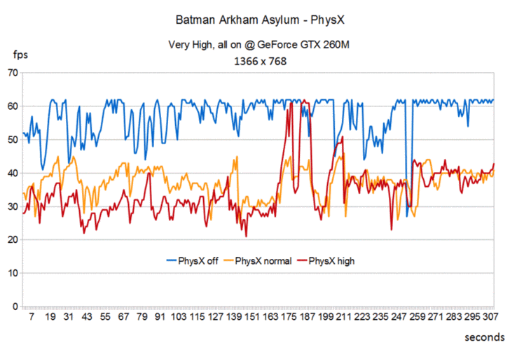 Da uns dieser große Unterschied etwas stutzig machte, entschieden wir uns noch für einen in-Game Benchmark mithilfe des Tools Fraps. Hier zeigten sich deutliche Unterschiede zum integrierten Benchmark. So brach die durchschnittliche Bildwiederholrate bei deaktiviertem PhysX mit 57.2 statt 100 fps nahezu um die Hälfte ein. Der Unterschied mit aktiviertem PhysX fällt hingegen wesentlich geringer aus. In der normalen Einstellung sank die durchschnittliche Wiederholrate von 43 auf 37.4 fps leicht. In hohen PhysX-Einstellungen blieb der Wert mit durchschnittlich 34.6 statt 35 fps sogar nahezu identisch.