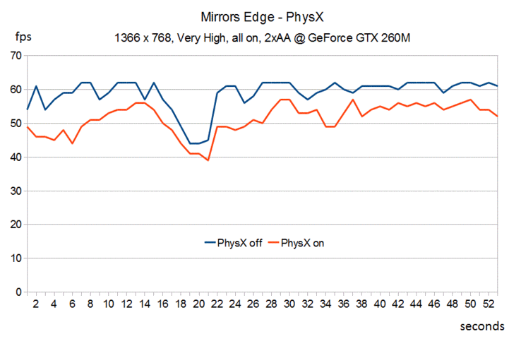 Bei der Performance gibt es kaum Anlass zur Kritik. Auf unserem Testsystem mit GeForce GTX 260M lief Mirrors Edge in der Auflösung 1366 x 768, sehr hohen Details und 2xAA mit durchschnittlich 59 fps rundum flüssig (kein PhysX). Aktiviert man noch PhysX sinkt die Performance „nur“ leicht auf durchschnittlich 51.5 fps, wodurch Mirrors Edge immer noch sehr gut spielbar ist. So reichen wohl auch Mittelklassekarten vom Schlag einer GeForce GT 240M um Mirrors Edge inklusive der PhysX-Effekte zu genießen. Es bleibt jedoch anzumerken, dass man, bis auf den zerstörbaren Stoff, kaum Unterschiede wahrzunehmen vermag.