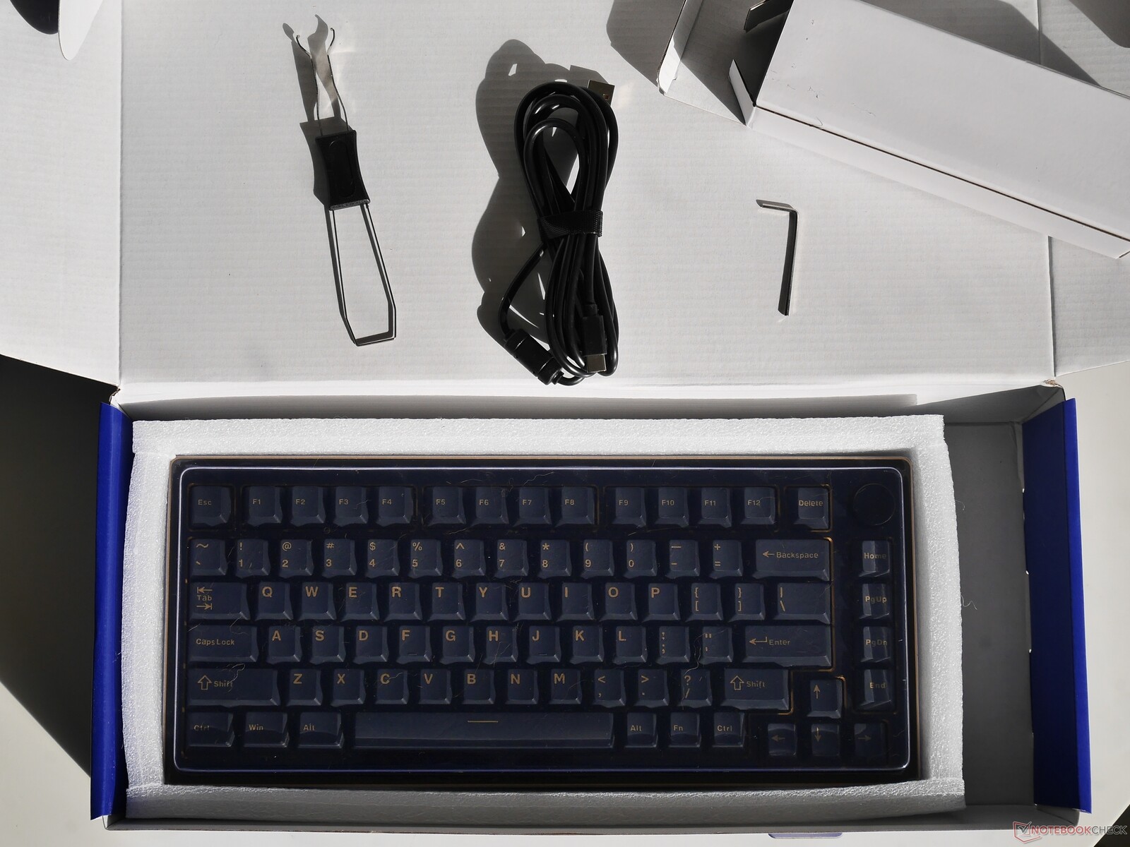 Das Auspackerlebnis der Epomaker Tide 75 ist eine Art zweischneidiges Schwert: Alle notwendigen Zubehörteile sind zwar enthalten (eine Kombination aus Tastenkappen- und Schalterabzieher, ein USB-Typ-C-zu-A-Kabel und ein Inbusschlüssel für die Demontage), aber die Verpackung ist ansonsten eher einfach gehalten, mit einem gedruckten Design und einer billigen Schaumstoffpolsterung im Inneren des Kartons. Es gibt auch keine Extras wie zusätzliche Schalter oder andersfarbige Tastenkappen - im Gegensatz zu der Keychron K15 Max, die wir uns kürzlich angeschaut haben.