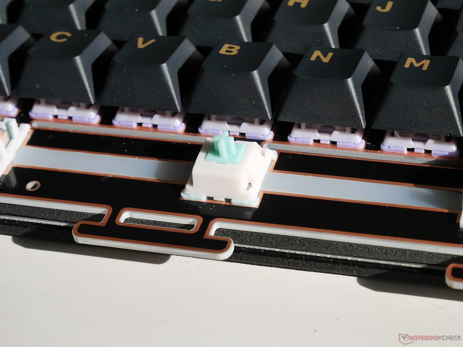 Die Cherry-Profil-Double-Shot-PBT-Tastenkappen auf der Tide 75 sind insgesamt recht schön, mit klaren, zentrierten Legenden in einer netten goldenen Farbe, die zu den restlichen Akzenten auf der Tastatur passt. Die Wände der Tastenkappen sind dick und sitzen alle in der richtigen Höhe auf dem Board.