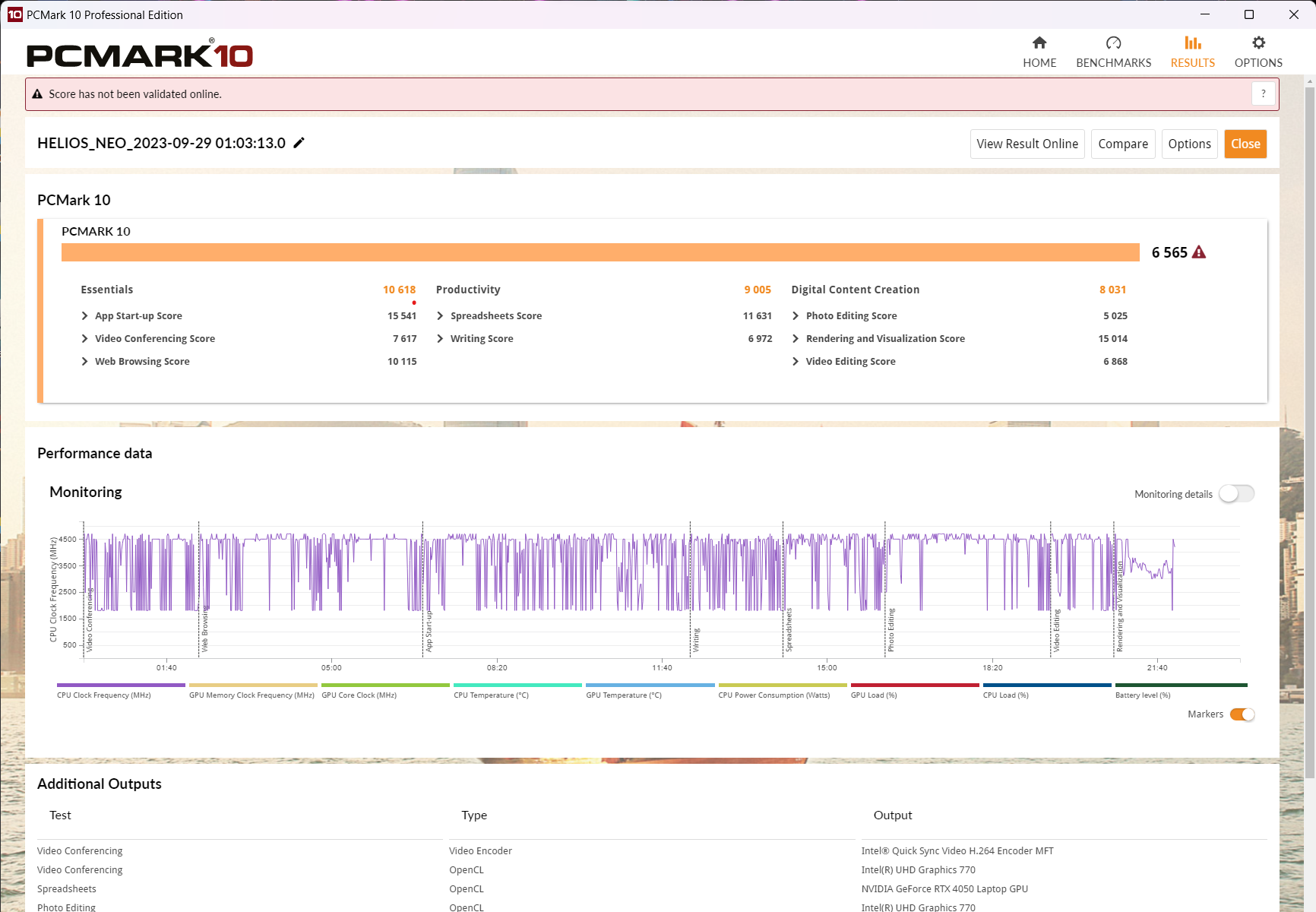 Die CPU erreicht bis zu 92 °C, schwankt aber so stark, dass selbst nach einer Stunde noch die 80-°C-Marke zeitweise unterschritten wird. Die Leistungsaufnahme beträgt im Durchschnitt 58 W, während das Helios 16 (Non-Neo) mit i7-13700HX trotz (fast) gleichem Kühlsystem 100 W ziehen darf. Die GPU taktet von 2.560 MHz (Maximaltakt) schnell auf etwa 2.350 MHz herunter und erreicht Temperaturen von bis zu 87 °C.