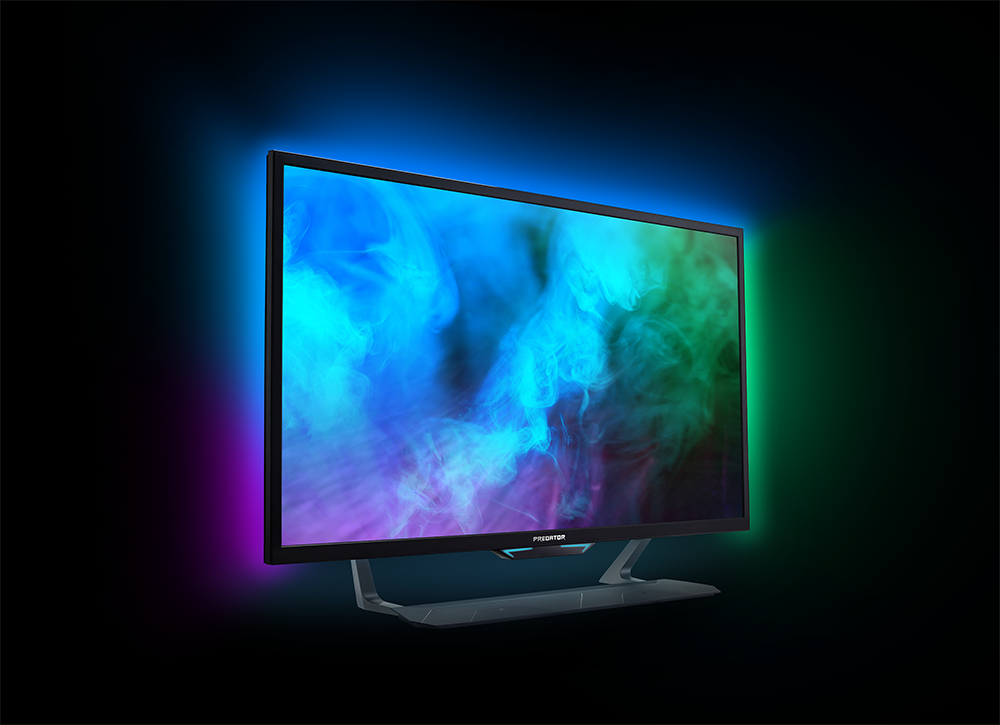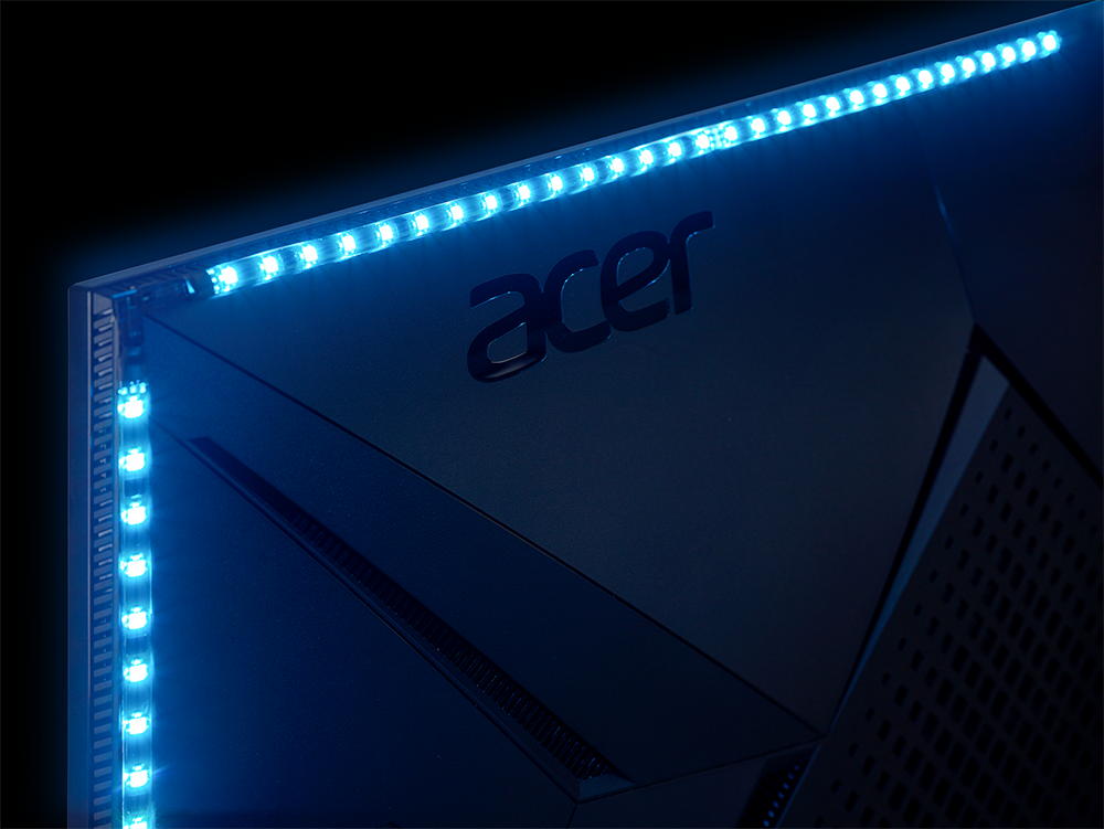 Die maximale Helligkeit gibt Acer mit 1.000 Nits an. Die DCI-P3-Farbraumabdeckung liegt bei 90 Prozent, das DeltaE unter 1. Dazu gibt es eine VESA DisplayHDR 1000-Zertifizierung und einen Bewegungssensor, der den Monitor bei Abwesenheit automatisch herunterdimmt. Auf der Rückseite ist außerdem ein RGB-Leuchtstreifen verbaut, der das Umfeld passend zu den Inhalten beleuchtet.