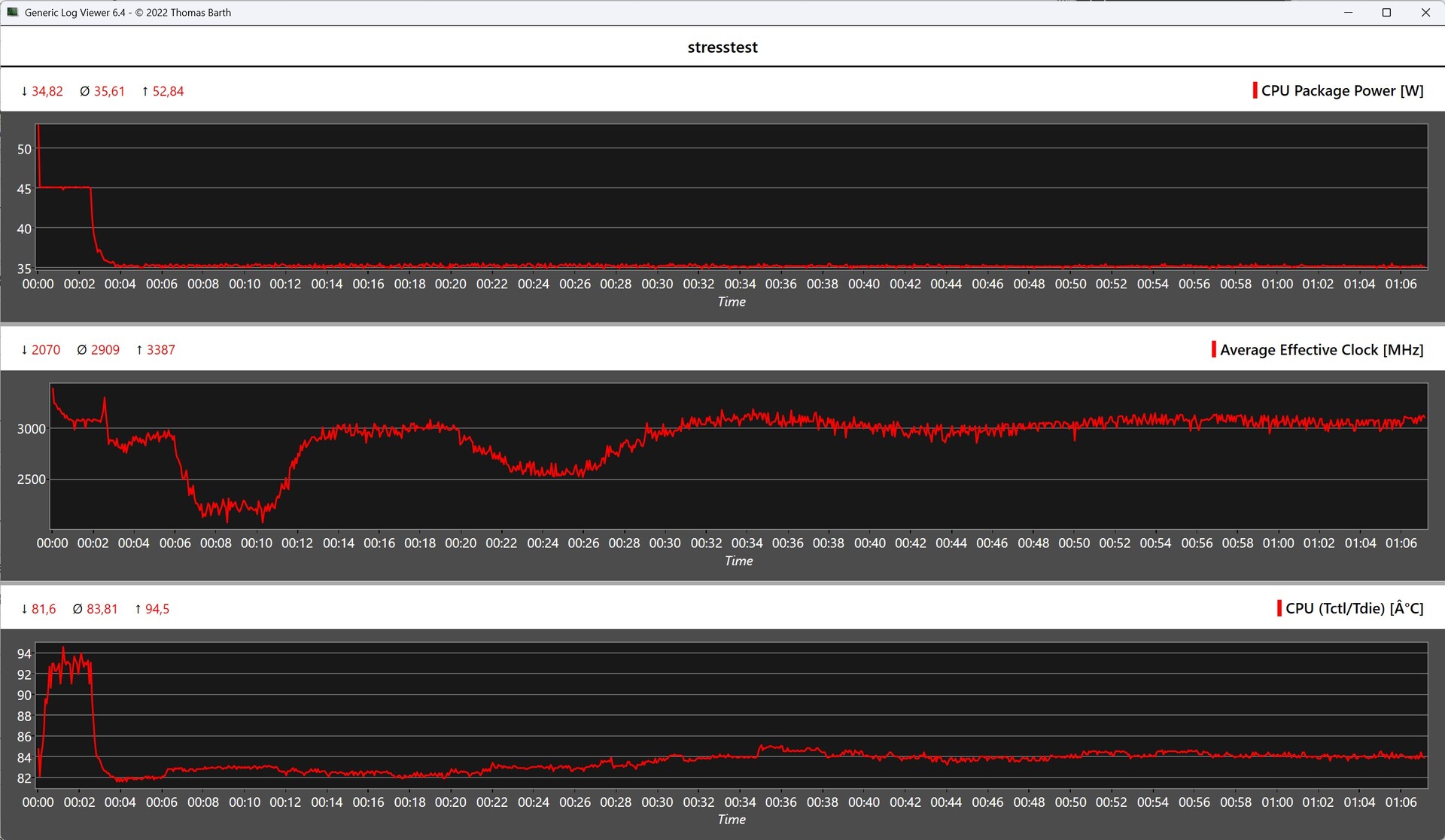 Dank seiner durchdachten Kühlkonstruktion bleibt das Gehäuse des Alliwava H90 Pro auch unter hoher Last überwiegend kühl. Lediglich im Bereich der hinteren Lüftungsöffnungen ist eine spürbare Erwärmung festzustellen. Im Stresstest erreicht der AMD Ryzen 7 8745HS kurzzeitig Temperaturen von rund 94 °C, was jedoch noch im unbedenklichen Bereich liegt. Die durchschnittliche Leistungsaufnahme der APU beträgt dabei etwa 35 Watt.