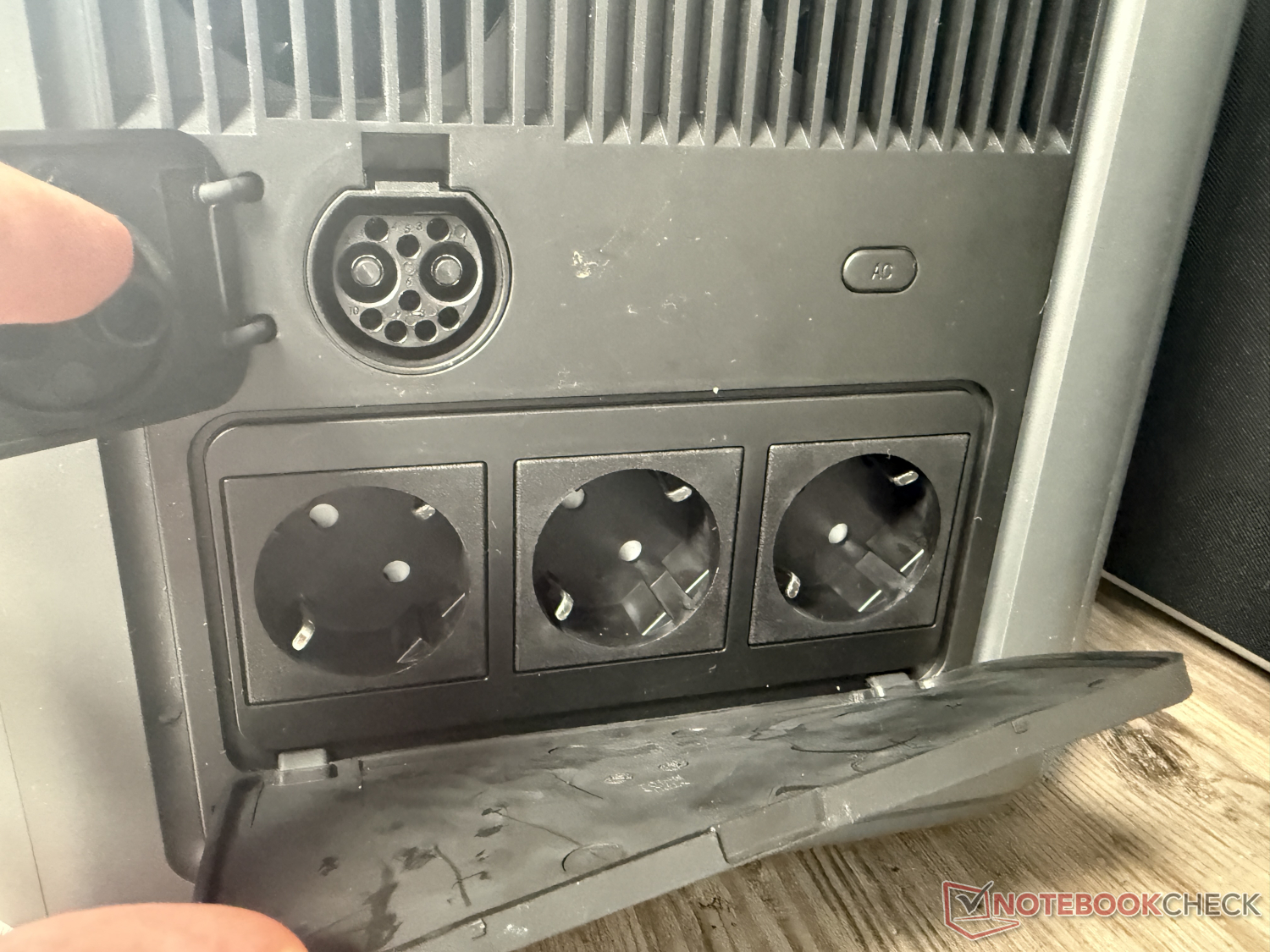 Während das App-Thema eine kleine Katastrophe ist, macht die Hardware selbst einen soliden Eindruck. Die Verarbeitung ist ordentlich. Praktisch ist, dass beispielsweise die AC-Anschlüsse an der Seite hinter einer Gummiklappe sitzen. Somit sind sie gegen Spritzwasser geschützt, auch wenn die Klappe selbst den Zugang zu den Steckdosen etwas erschwert.