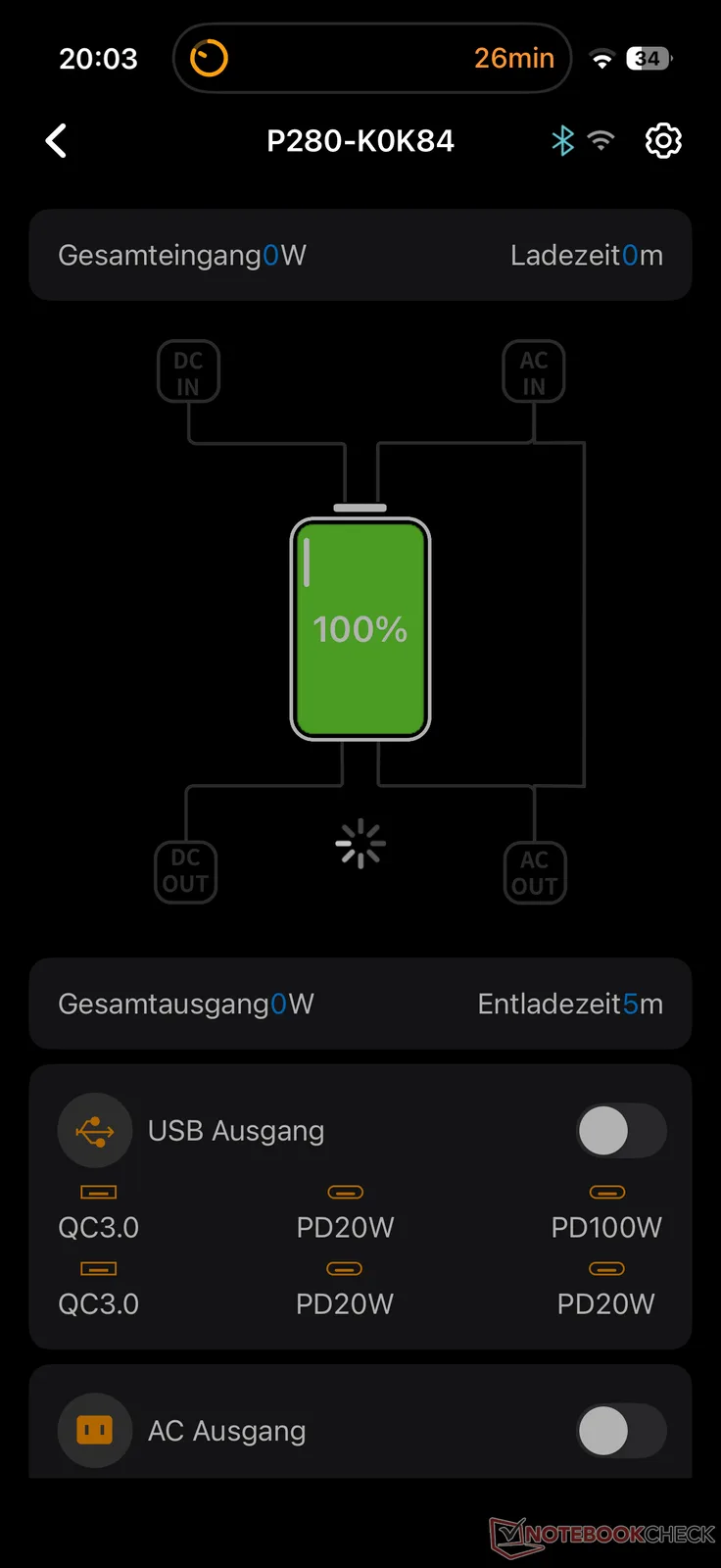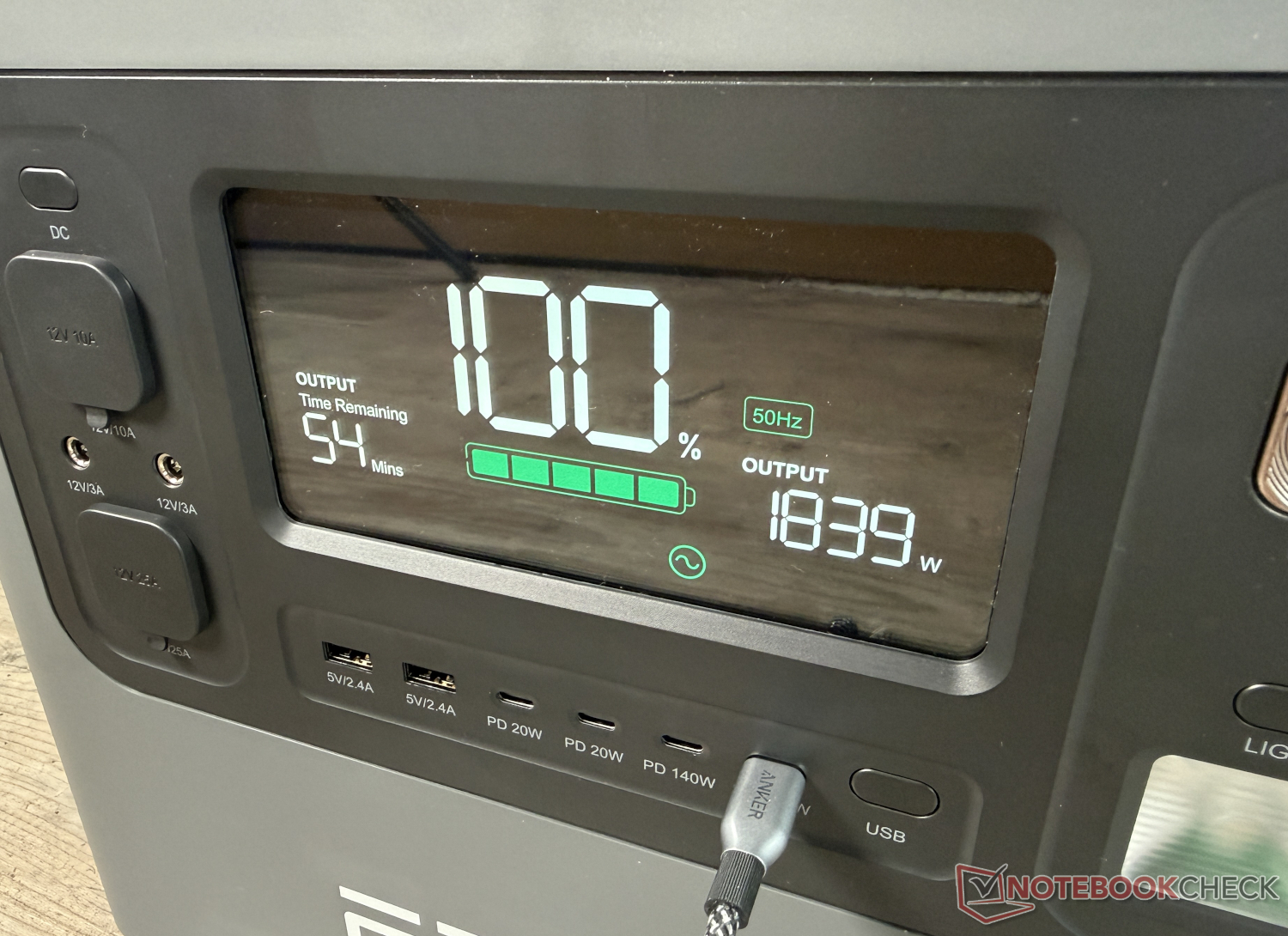 Beim AC-Laden hat die Powerstation vom Start weg und bis gut 60 Prozent die versprochenen 1.800 W erreicht. Nach rund 65 Minuten waren 80 Prozent geladen, nach weiteren 50 Minuten der Ladevorgang komplett abgeschlossen. Der Solarladevorgang konnte mangels Sonnenschein im aktuellen Hamburger Winter nur bedingt getestet werden. Bei DC-Laden und -Entladen (Gleichstrom) liegt die Effizienz in der Regel deutlich höher, da die Umwandungsverluste in Wechselstrom entfallen.