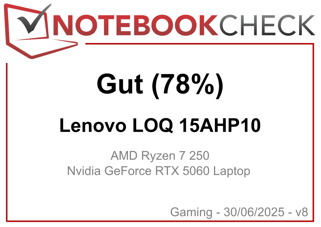 | Lenovo LOQ 15AHP10 AMD Ryzen 7 250 ⎘ NVIDIA GeForce RTX 5060 Laptop ⎘ 16 GB RAM, 1024 GB SSD | Amazon: Bestpreis 1092€ expert ecommerce 2. 1092€ expert.de 3. 1092€ expertDeutschland | 2.4 kg | 24 mm | 15.60" 1920x1080 141 PPI IPS | |