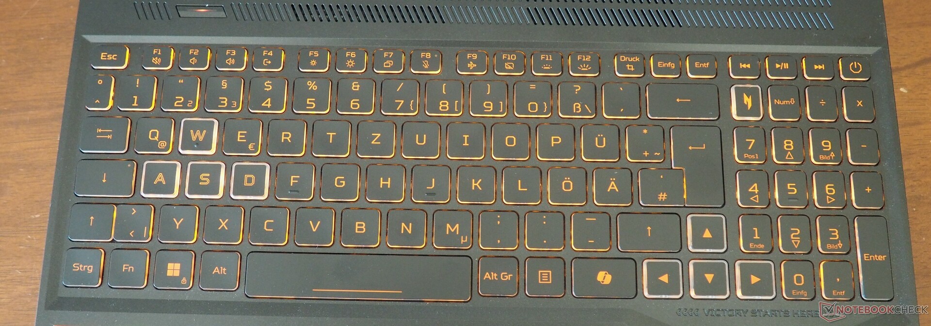 Das Chassis orientiert sich am typischen Niveau eines Midrange-Gamers. Die Kunststoffoberflächen bieten eine passable Stabilität und sind insgesamt gut verarbeitet. Der maximale Öffnungswinkel fällt mit ca. 145° hingegen überdurchschnittlich aus. Passend zu den orange beschrifteten Tasten ist auch die Beleuchtung des Keyboards orange gehalten.