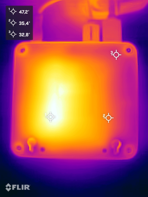 (-) Auf der Unterseite messen wir eine maximalen Wert von 49.5 °C (im Vergleich zum Durchschnitt von 36.6 °C).