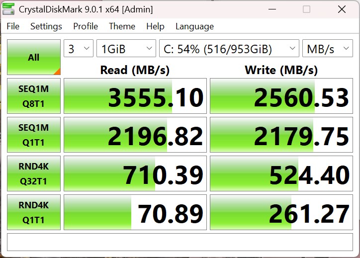 Im GMKtec NucBox M3 Ultra ist eine 1-TB-SSD von TWSC verbaut. Der Massenspeicher nutzt das PCIe-3.0-x4-Interface und bietet solide Transferraten, die für den Alltag vollkommen ausreichen. Die aktive Kühleinheit ist nicht vorhanden, wodurch unter Dauerlast die Leistung etwas einbricht. Zudem steht ein zweiter M.2-2280-Steckplatz für den Einbau einer zusätzlichen SSD zur Verfügung.