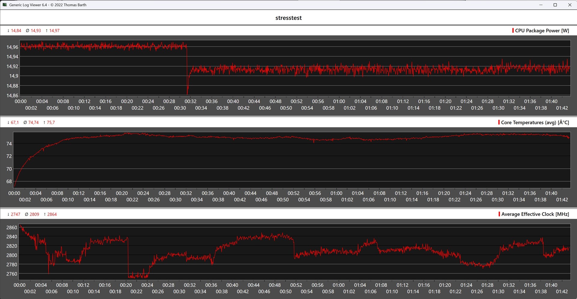 Die Cinebench-R15-Dauertests belegen, dass NiPoGi beim AM06 Pro ein gut abgestimmtes Kühlsystem einsetzt, das die APU auch unter anhaltender Last stabil hält. Der Prozessor erreicht kurzfristig eine Leistungsaufnahme von bis zu 20 Watt, bleibt dabei aber thermisch unkritisch – die maximale Temperatur liegt bei moderaten 74 °C. Leistungseinbußen durch Überhitzung treten im Test nicht auf.