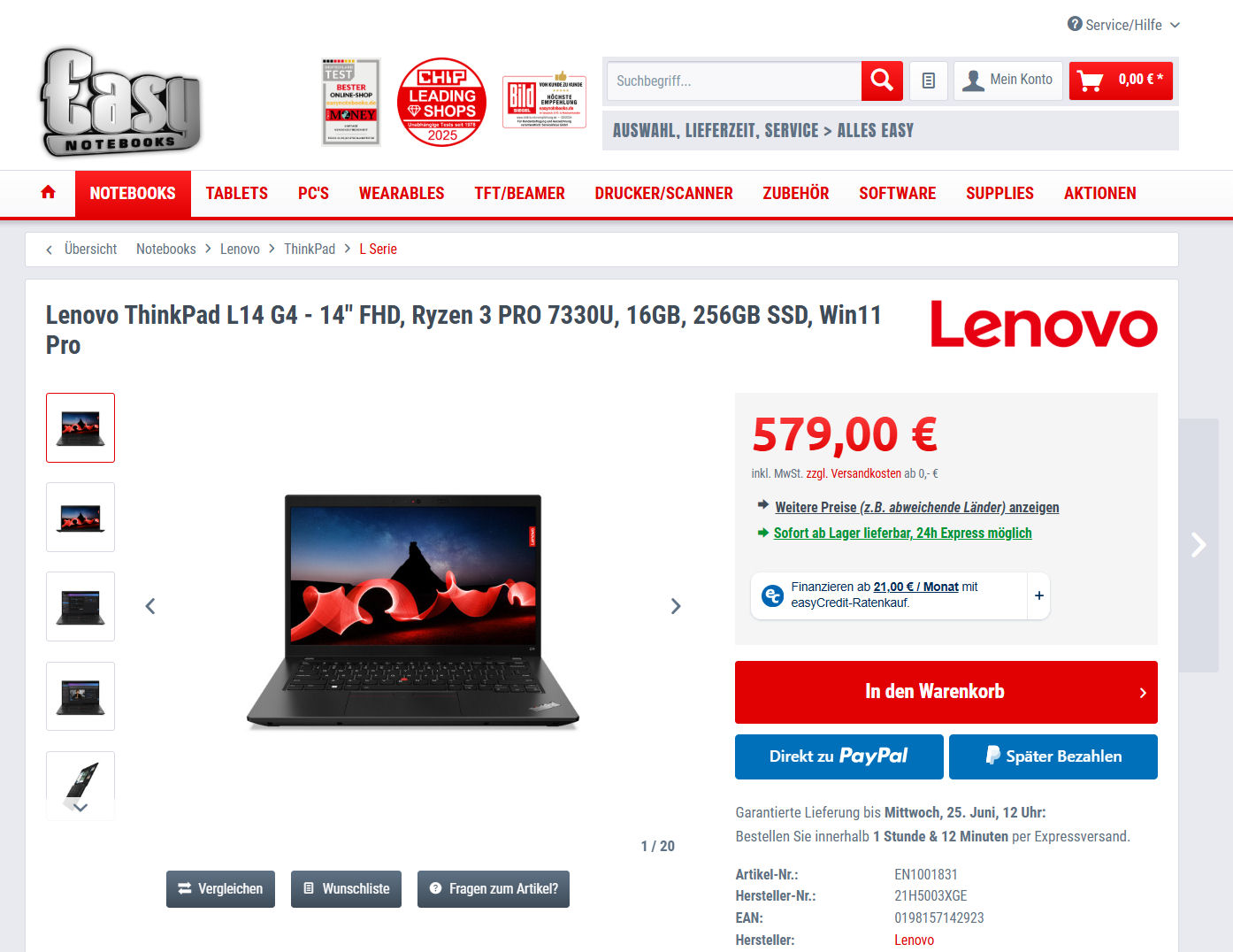 Die ThinkPad-L-Reihe steht innerhalb des Lenovo-Sortiments für Business-Laptops der Mittelklasse. Aktuell führt Easynotebooks.de mit dem ThinkPad L14 G4 21H5003XGE ein AMD-basiertes Einstiegsmodell der Reihe zu einem Preis von 579 Euro im Sortiment. Ein stärkeres Schwestermodell erreichte in unserem Test die Note „Sehr Gut (89 %)“.