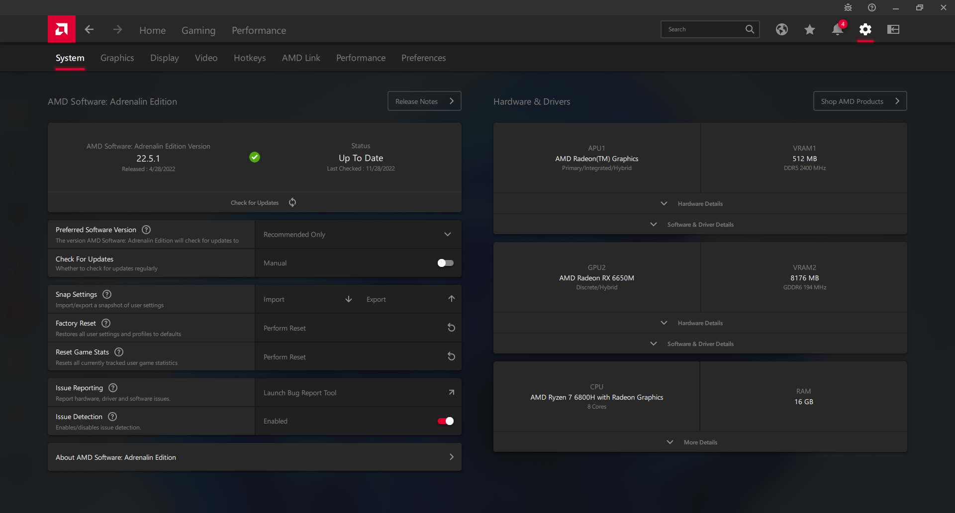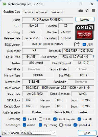 Bei unserem Testgerät handelt es sich um das exklusive AMD-Modell mit dem Ryzen 7 6800H, einer Radeon RX 6650M mit einer TGP von 105 W und einem 144-Hz-1080p-IPS-Display für 1.699 Euro. Es ist einer von wenigen Laptops mit Radeon-RX-6650M-Grafik.