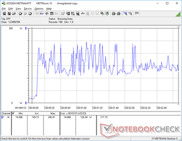 Wir konnten an dem großen (~17,9 x 8,5 x 2,5 cm) 280-W-Netzteil bei hundertprozentiger Auslastung von CPU und GPU einen temporären Spitzenverbrauch von 246 W messen.