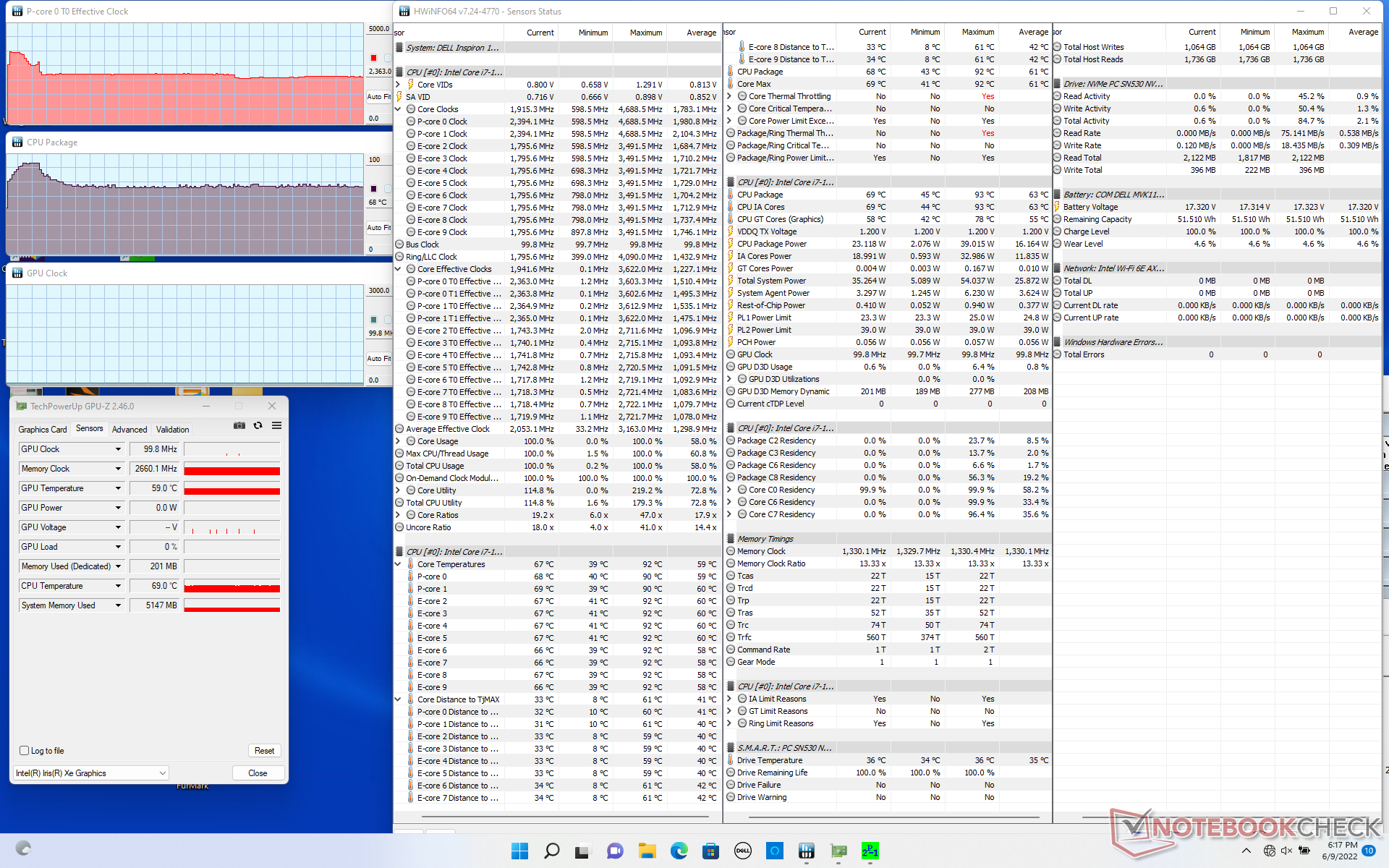 Beim Stressen mit Prime95 taktet die CPU für die ersten paar Sekunden auf 3,6 GHz hoch bis die Kerntemperaturen 92 °C erreichen. Danach fallen die Taktraten und stabilisieren sich bei 2,4 GHz, um eine Temperatur von kühleren 68 °C zu halten. Die CPU Package Power beträgt anfangs 39 W, bevor sie sich durch die thermischen Limits bei 23 W stabilisiert. Es ist selten, dass ein Subnotebook-Convertible für einen längeren Zeitraum hohe Turbo-Boost-Taktraten hält und das Inspiron bildet keine Ausnahme. Der gleiche Test auf einem LG Gram 14T90P mit dem langsameren Gen11 Core i5-1135G7 resultiert in einer etwas höheren Kerntemperatur von 73 °C, aber einer niedrigeren Package Power von 18 W.