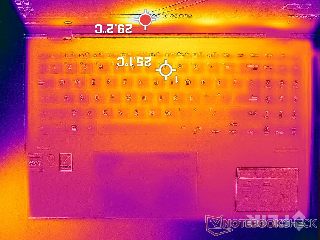 Die Oberflächentemperaturen sind im Tastaturbereich niedriger als beim Vorgänger Zenbook Flip 15 UX563FD, obwohl das neue Modell eine Core-H-CPU nutzt. Beim Spielen von The Witcher 3 erreichen die wärmsten Stellen auf der Ober- und Unterseite beispielsweise 33 bzw. 38 °C, beim UX563FD waren es 42 bzw. 46 °C. Unser Zenbook Flip 15 Q539ZD bietet also eine höhere Leistung, ohne dabei unbedingt wärmer zu werden.