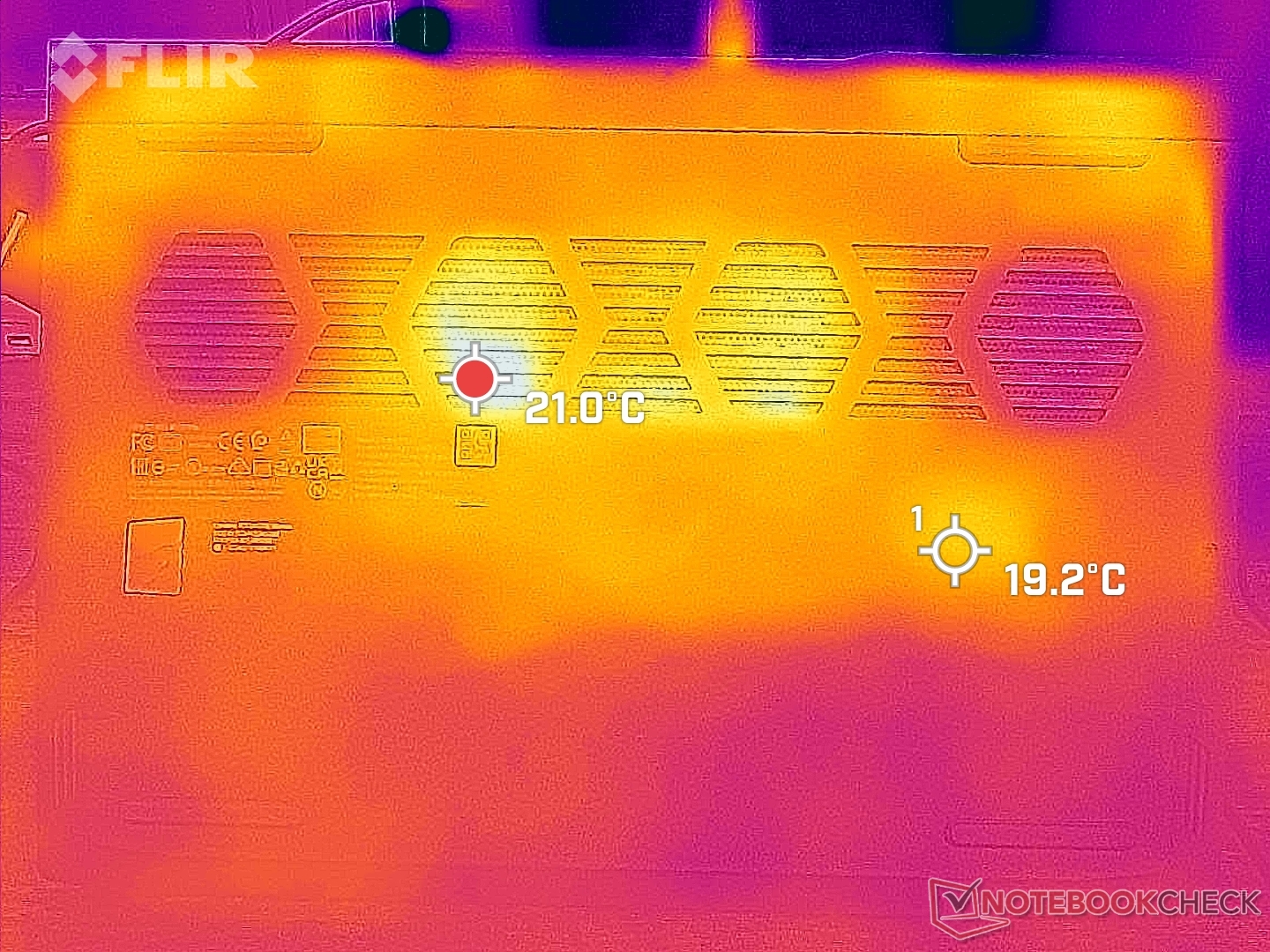 (+) Die Handballen und der Touchpad-Bereich erreichen maximal 34.2 °C und damit die typische Hauttemperatur und fühlen sich daher nicht heiß an.