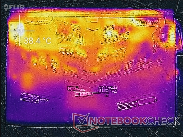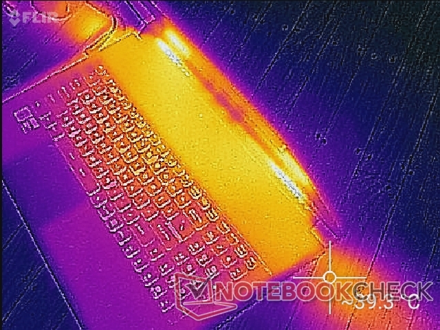 Die Oberflächentemperaturen sind im hinteren Bereich höher als vorne. Vor allem der flache Bereich über der ersten Tastenreihe erwärmt sich immer deutlich stärker als die Handballenauflagen oder die Tastatur. Beim Spielen kann diese Fläche mehr als 40 °C erreichen, während die Temperatur der Handballenauflagen und die WASD-Tasten bei nur 26 bis 29 °C liegen. Bei der Wärmeentwicklung schneidet unser Testgerät besser ab als das konkurrierende Lenovo IdeaPad L340-17, bei dem sich die WASD-Tasten mit 41 °C unter den gleichen Bedingungen deutlich stärker erwärmen. Die Unterseite des MSI-Laptops bleibt aufgrund der unglaublich vielen Belüftungsschlitze und des großen Gehäuses relativ kühl.
