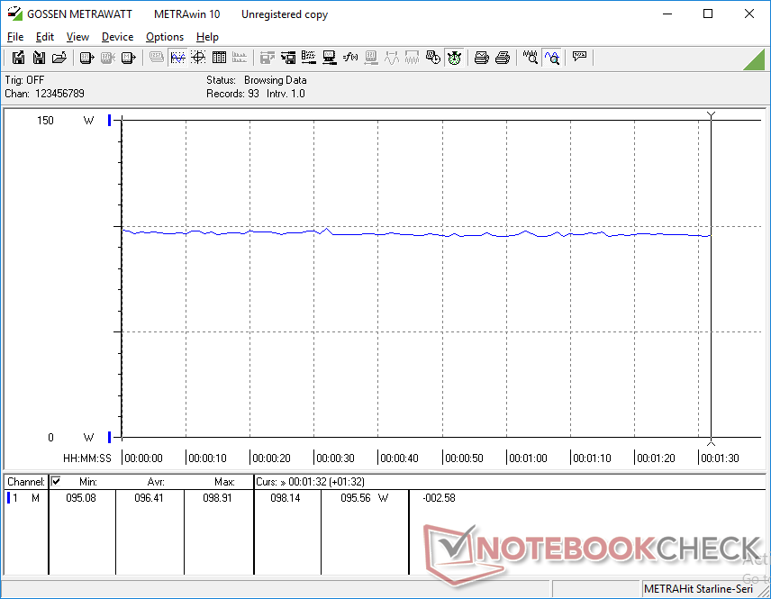 Mit 13 W ist der Verbrauch im Leerlauf überraschend hoch, was vermutlich auf Hintergrundaktivität zurückzuführen ist. Davon abgesehen verbraucht der Laptop unter höherer Last genau so viel Strom wie das Modell aus dem letzten Jahr. Im Gaming-Betrieb können wir eine Energieaufnahme von 87 bis 97 W messen, während das GF75, welches mit einer leistungsfähigeren Core-i7-CPU ausgestattet ist, zwischen 94 und 106 W und das Lenovo IdeaPad L340 mit dem vergleichbaren Core i5-9300H zwischen 75 und 92 W verbraucht.