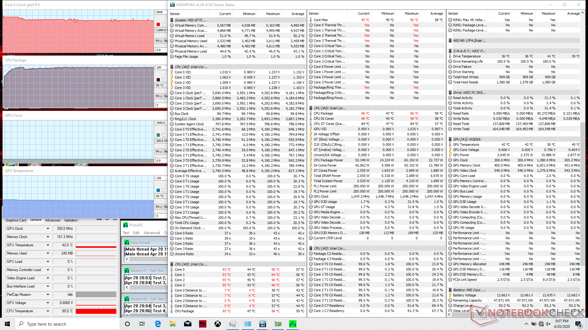 Um das Verhalten der CPU-Taktfrequenz zu prüfen und mögliche Stabilitätsprobleme festzustellen, setzen wir das System künstlichen Lasten aus. Beim Ausführen von Prime95 erreicht die CPU mittels Turbo Boost 4 bis 4,2 GHz und nach ca. 20 Sekunden eine Kerntemperatur von 95 °C. Anschließend fällt die Taktfrequenz auf den 3,8-bis-3,9-GHz-Bereich, um die Kerntemperatur von 95 °C aufrechterhalten zu können. Dabei bleibt die Temperatur der Grafikkarte unverändert, da sich CPU und Grafikkarte keine Heatpipes teilen.