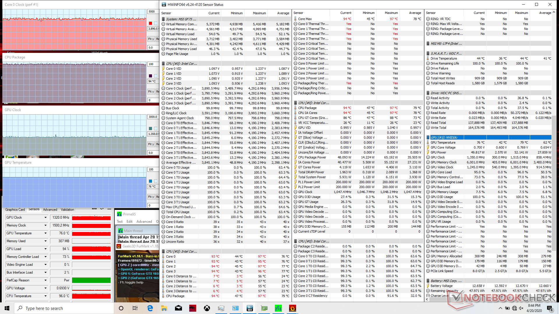 | Prime95 + FurMark Stress | 3.8 - 3.9 | 1320 | 94 | 76 |