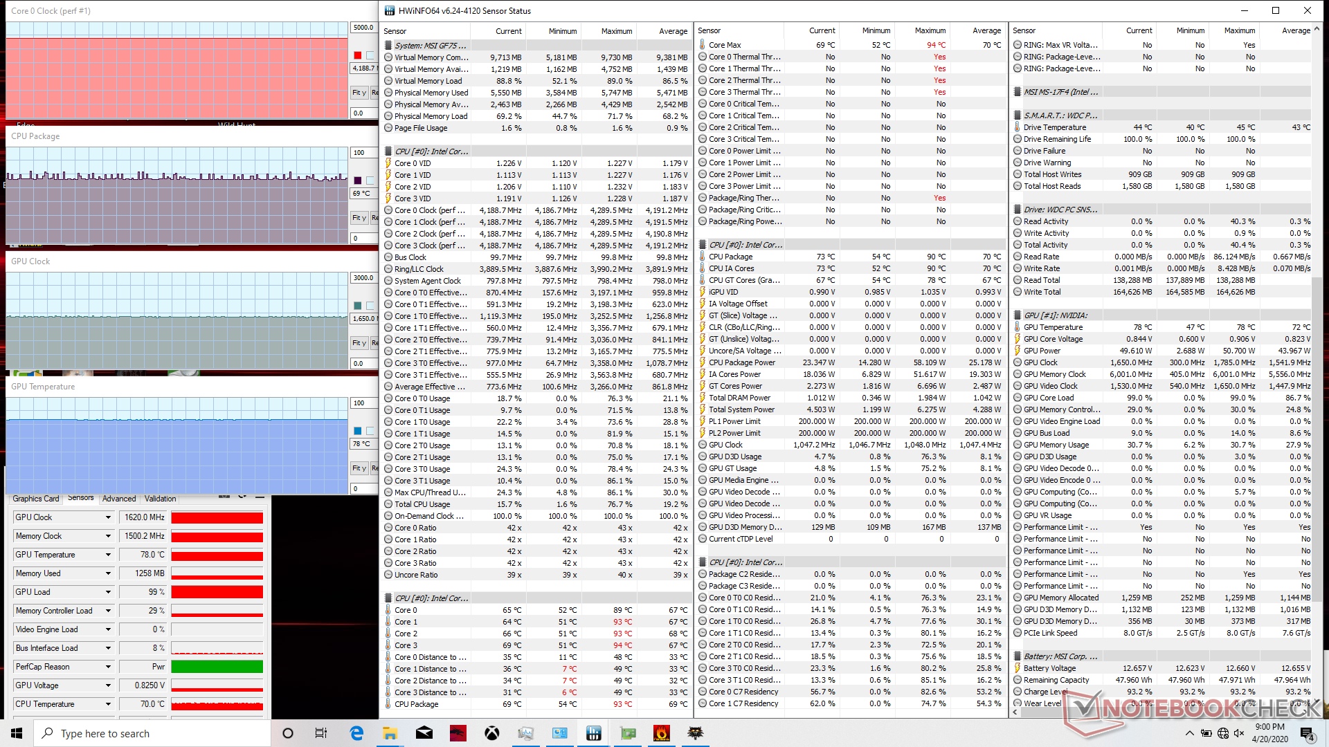 The Witcher 3 zu spielen repräsentiert praktische Gaming-Lasten jedoch besser. Hier pendeln sich CPU und GPU bei 69 bzw. 78 °C ein, was fast genau den Werten des GF75 mit Core i5-9300H aus dem letzten Jahr entspricht. Im Modus "Cooler Boost" (maximale Lüftergeschwindigkeit) können die Kerntemperaturen um bis zu 14 °C fallen und die GPU-Taktfrequenz leicht ansteigen (1.695 MHz statt 1.620 MHz). Unserer Ansicht nach steht hier der leichte Anstieg der GPU-Leistung jedoch in keinem Verhältnis zu der extrem hohen Lautstärke.