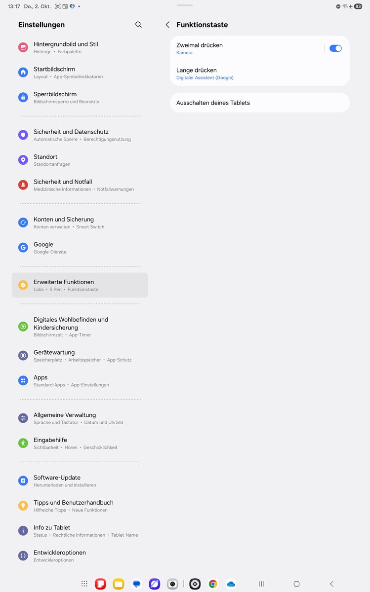 Für die biometrische Sicherheit ist ein optischer Fingerabdrucksensor ins Display integriert worden. Dieser befindet auf der rechten kürzeren Seite des Galaxy Tab S11 Ultra und ist im Querformat gehalten optimal erreichbar. Wer das Tablet hochkant nutzt, muss jedoch umgreifen. Zusätzlich oder alternativ steht eine Gesichtserkennung über die Frontkamera bereit, welche jedoch weniger sicher ist, bei guten Lichtverhältnissen aber sehr zuverlässig arbeitet.
