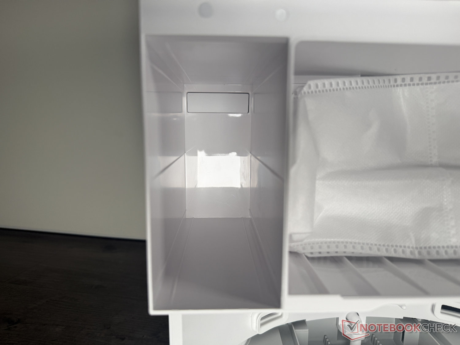 Geliefert wird der Mova S70 Roller ohne Zubehör, aber mit einer schlicht gestalteten Reinigungsstation. Neben der üblichen Absaugung in einen 3,2 l fassenden Staubbeutel wäscht diese die Wischrolle mit 80°C heißem Wasser und trocknet sie anschließend mit 70°C heißer Luft. Eine Selbstreinigung der Station gibt es ebenso wenig wie eine automatische Dosierung von Reinigungsmittel. Der dafür vorgesehene Platz in der Station ist leer.