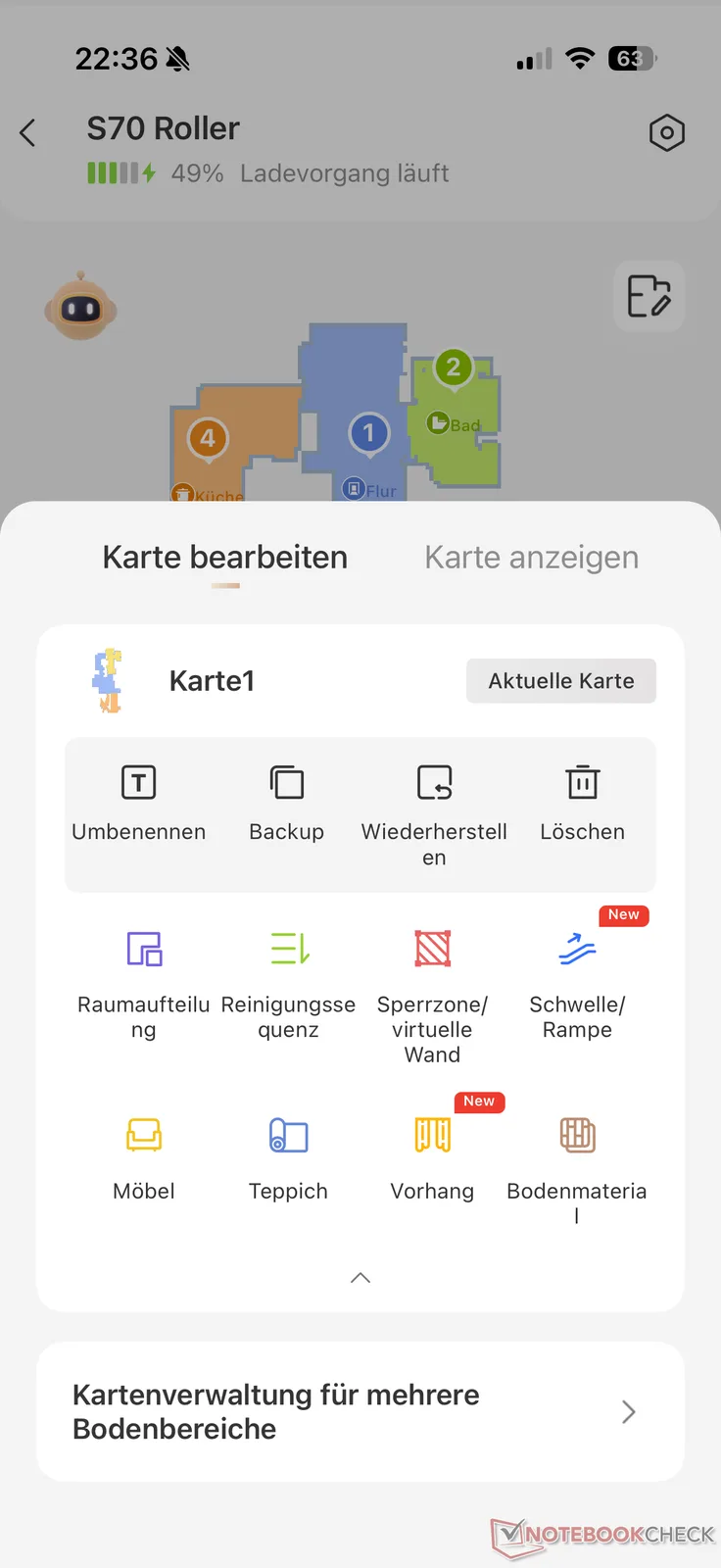 Der Einrichtungsvorgang des Mova S70 Roller, sprich die Verbindung zwischen Roboter, App und WLAN, hat im Test problemlos funktioniert. Anschließend folgt eine kurze Kartierungsfahrt, um die virtuelle Karte der Umgebung anzulegen. Diese war hinsichtlich der automatischen Raumerkennung nicht so genau wie bei manchem Flaggschiff, aber mit wenigen Fingertipps über die übersichtliche Kartenverwaltung angepasst. Nach wenigen Minuten ist der Mova S70 Roller einsatzbereit.