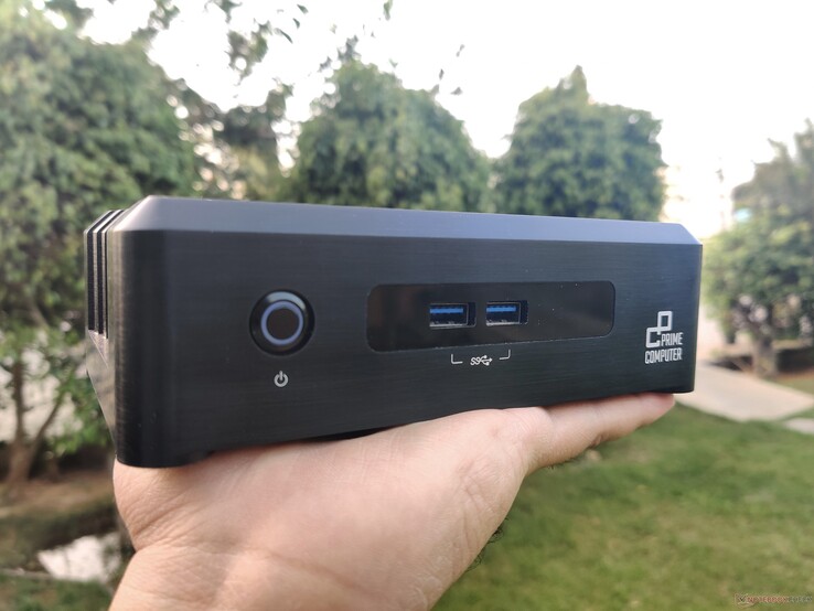 Der PrimeMini 5 hat ein attraktives Design, das ihm einen Premium-Eindruck verleiht, der schon beim ersten Auspacken und auch später bei der Verwendung des Geräts zur Geltung kommt. Mit einer Breite von 17,7 cm und einem Gewicht von 1,3 kg ist der PrimeMini 5 nicht der schnittigste Mini-PC auf dem Markt. Allerdings hat das Gerät dennoch eine sehr kleine Standfläche und passt mit seinem minimalistischen Design auf die meisten Arbeitsplätze.