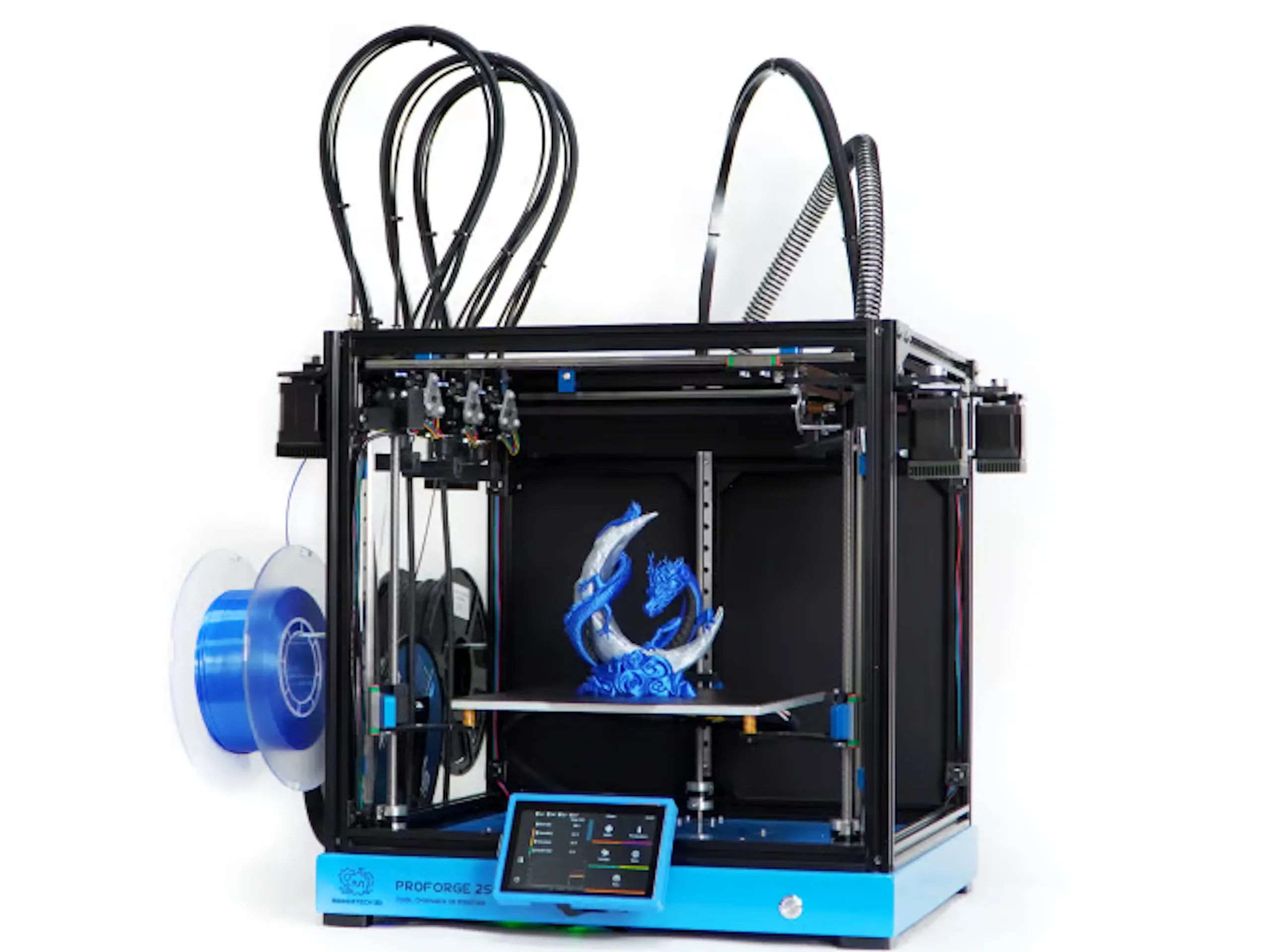 Makertech 3D bietet einen neuen 3D-Drucker an. Beim Proforge 250 handelt es sich um ein System, welches während des Druckvorgangs zwischen verschiedenen Druckdüsen wechseln kann. Damit ist der Druck mit verschiedenen Farben möglich, gleichzeitig können in einem Modell aber auch verschiedene Materialien genutzt werden, womit bestimmte Anteile eines 3D-Drucks beispielsweise flexibler sein können. Herstellerangaben zufolge kann in einem Druck der Druckkopf auch über 1.000 Mal gewechselt werden. Beworben wird zudem die Möglichkeit, Stürzstrukturen mit einem wasserlöslichen Filament wie PVA zu drucken - dieses lässt sich dann einfach in einem Wasserbad entfernen.