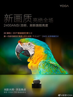 Der Lenovo YOGA 7000 Smart Projector ist mit einem 0,47 Zoll großen optischen DMD-Micromirror-Chip bestückt. Dazu kommt Osrams LED-Lichttechnologie mit vier Lampen, die eine Bildhelligkeit von 2.400 ANSI Lumen erreichen sollen. Das Gerät unterstützt laut Herstellerangaben die Decodierung von 8K-Content. Dazu gibt es eine optische Zoomfunktion, mit dem das Bild ohne Qualitätsverluste vergrößert oder verkleinert werden kann, und den EEP Intelligent Image Quality Engine 2.0 zur Verbesserung des Bildes.