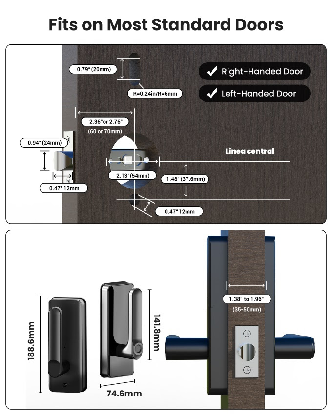 Herstellerangaben zufolge lässt sich das Schloss an die meisten Standard-Türen montieren, so werden etwa 35 bis 50 Millimeter dicke Türblätter unterstützt. Prosenic zeigt in einer Grafik, welche Abmessungen Türen besitzen dürfen. Die Akku- beziehungsweise Batterielaufzeit wird auf über 3.000 Betätigungen beziffert. Im Notfall kann das Schloss auch extern und etwa mit einer Powerbank über einen USB Typ C-Port mit elektrischer Energie versorgt werden.