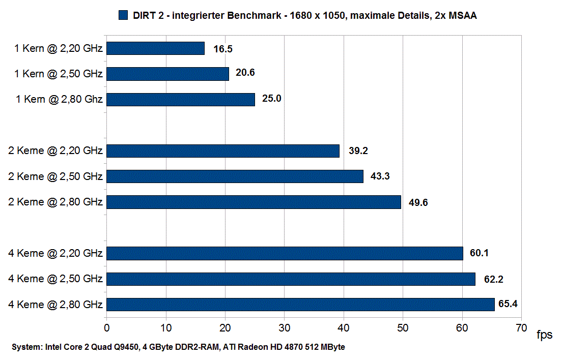Im Folgenden haben wir den Q9450 mit jeweils unterschiedlichen Taktraten (2.2, 2.5 & 2.8 GHz) wiederholt durch den integrierten Benchmark von DIRT 2 geschickt, wobei wir per Bios sukzessive zwei respektive drei Kerne deaktivierten, um einen Dual-Core bzw. Single-Core zu simulieren. Die Grafikdetails waren auf Anschlag. Das Ergebnis fiel hierbei wie erwartet aus: Mit nur einem CPU-Kern ist DIRT 2 grundsätzlich unspielbar. Eine Takterhöhung wirkt sich zwar merklich aus, ist dennoch nicht dazu in der Lage, die Bildwiederholrate auf ein akzeptables Niveau zu heben. Mit einem Dual-Core verdoppelt sich die Bildwiederholrate hingegen und DIRT 2 lässt sich angenehm spielen. Auch hier wirkt sich eine Takterhöhung messbar aus. Mit einem Quad-Core läuft DIRT 2 im Vergleich zu zwei Kernen nochmals um rund 50% schneller. Der Takt hat unterdessen kaum noch einen Einfluss auf die Geschwindigkeit.