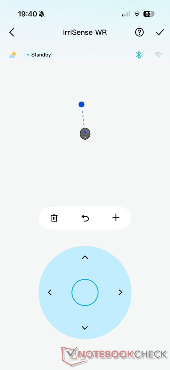 Ist das Gerät in der App hinzugefügt, muss zunächst eine virtuelle Karte der zu bewässernden Fläche angelegt werden, optional mit Unterstützung durch Kartenmaterial von Google Maps nach Eingabe der Adresse. Für die Kartierung wird der Wasserstrahl per virtuellem Steuerkreuz über die zu bewässernde Fläche gelenkt, was sehr feinfühlig und genau funktioniert.
