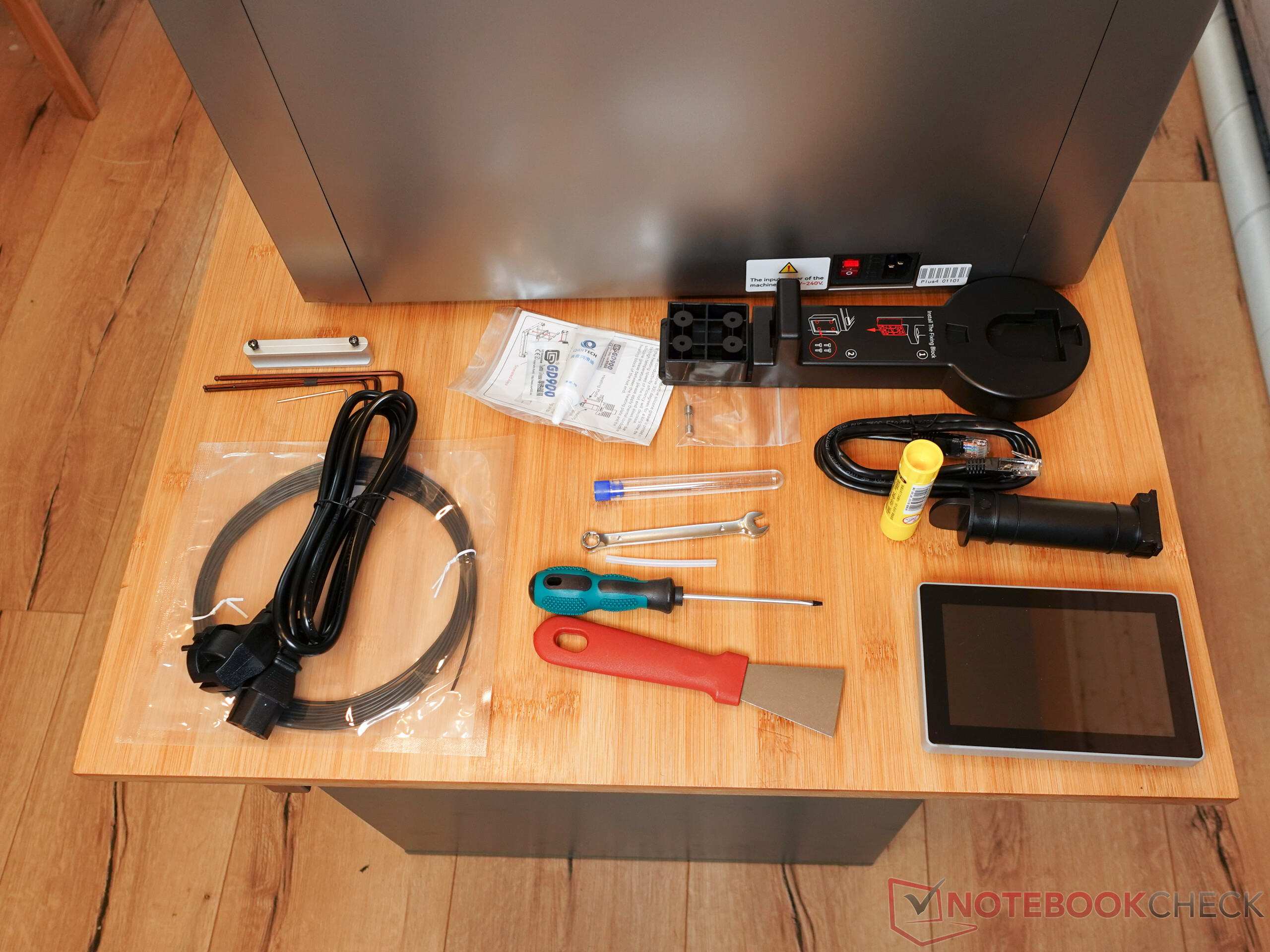 Die Inbetriebnahme des Qidi Plus4 3D-Druckers beginnt mit einfachen Schritten: Auspacken, Folien entfernen, den Türgriff montieren, den Bildschirm anschließen, Netzkabel einstecken und den Drucker einschalten. Doch obwohl der Qidi Plus4 schnell betriebsbereit aussieht, erfordert er für die erste Nutzung noch einige Einrichtungsschritte. Auf dem neu installierten Display erscheinen detaillierte Anweisungen für die Ersteinrichtung. Bis zur vollständigen Betriebsbereitschaft vergingen in unserem Test etwa anderthalb Stunden. Wichtig ist dabei, dass der Qidi Plus4 letztlich auf einem stabilen, ebenen Untergrund steht, um während des Druckens Vibrationen und Positionsfehler zu vermeiden. Auf wackligen Tischen könnten sich Vibrationen schnell aufschaukeln.