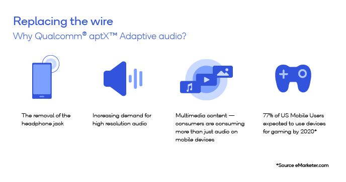 Das Ziel ist eine stabilere und gleichzeitig qualitativ bessere Audioverbindung um das Kabel tatsächlich ebenbürtig zu ersetzen - ob das gelingt, wird die Zukunft weisen. Für Konsumenten soll CD-Qualität geboten werden, die einfach transparent funktioniert, auch wenn sich die Bedingungen etwa in überlasteten Funkgebieten verschlechtern. Gleichzeitig ist AptX Adaptive nicht nur für die High-Res-Musikwiedergabe geeignet, sondern auch für Videostreaming, Gaming und andere Anwendungen, in denen es auf eine geringe Latenz ankommt. AptX Adaptive soll mit einer zukünftigen Snapdragon-Mobilplattform eingeführt werden, vermutlich dem Snapdragon 855 aka Snapdragon 8150 im Herbst.