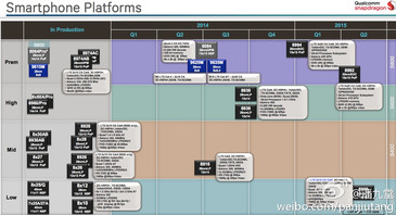 Gemäß den Informationen einer geleakten Roadmap für die Chipentwicklung bei Qualcomm, wird es noch in diesem Jahr weitere High-End-Prozessoren bei den Serien Snapdragon mit 64-Bit-Unterstützung geben. Schon im April diesen Jahres hatte Qualcomm beispielsweise seine Designs auf Basis des Snapdragon 808 und Snapdragon 810 angekündigt. Laut der Roadmap stehen in Q4/2014 nun konkret bei Qualcomm die in 28-nm-Fertigung produzierten SoCs der Reihe Snapdragon 610 (MSM8936) und Snapdragon 615 (MSM8939) an. Beide Chipsätze nutzen als GPU jeweils die Adreno 405.