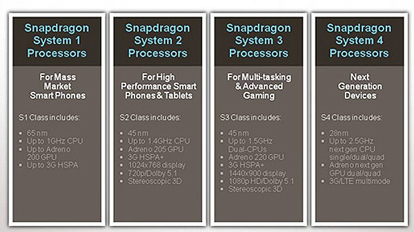 Die hochintegrierten Halbleiterchips von Qualcomm verrichten ihre Dienste mittlerweile in einer Vielzahl von Mobile-Geräten wie beispielsweise in Smartphones und Tablets. Qualcomm führt nun die 4 Klassen S1 bis S4 ein, die aufsteigend für mehr Gesamtleistung und Ausstattung stehen.