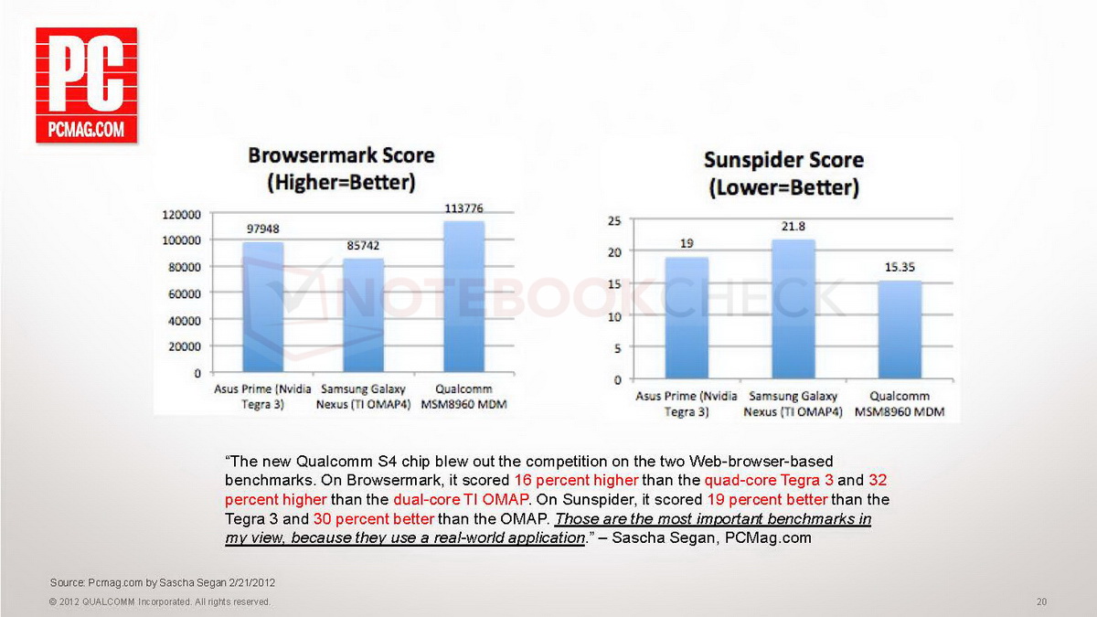 Im Rahmen seiner Präsentation verweist Qualcomm zur Darstellung der CPU-Leistung seiner Snapdragon S4 leider auch auf eine Reihe von Testergebnissen seitens Dritter, die mit Qualcomms Snapdragon Mobile Development Plattform (MDP) MSM8960 ermittelt wurden. Für einen "Realword"-Vergleich mit Seriengeräten sind derlei Ergebnisse quasi nutzlos. Genauso gut könnte man ein experimentelles Hochgeschwindigkeitsfahrzeug mit einem Kompaktauto aus der Serie vergleichen.