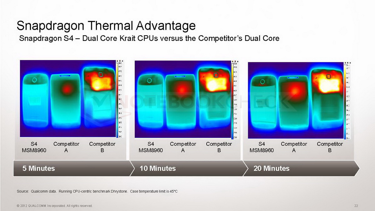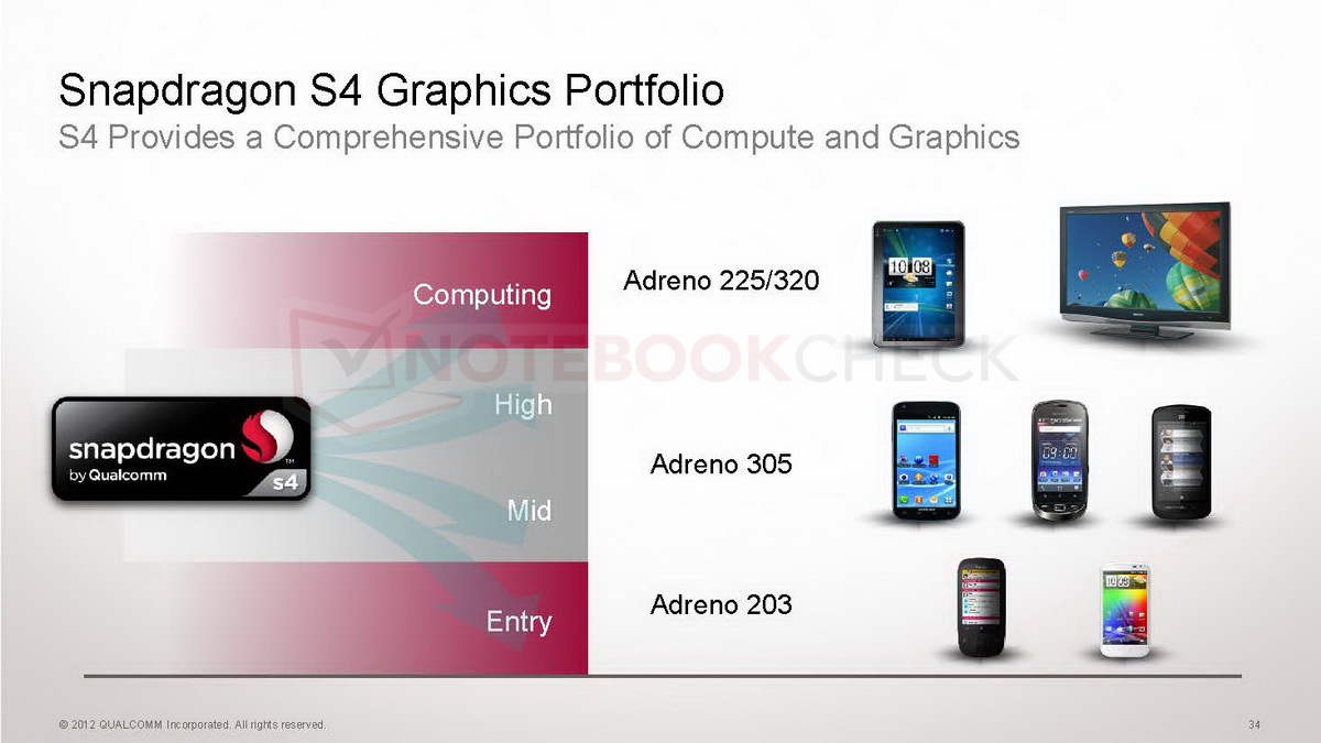 Viel spannender als Vergleiche mit einer Mobile Developer Plattform, die in dieser Form sowieso nie in den Handel kommen wird, sind beispielsweise die Aussagen von Qualcomm hinsichtlich den erweiterten Grafikfähigkeiten seines Snapdragon S4 Prozessoren. Interessant für Hersteller dürfte die hohe GPU-Skalierbarkeit der S4-Serie sein. Während die Konkurrenz von Qualcomm hier wenig Flexibilität an den Tag legt, packt Qualcomm je nach Aufgabe die passende GPU-Leistung in den SoC. Angefangen von der einfachen Adreno 203, über Adreno 305 und 220 bis hin zur nächsten Generation Adreno 320, die 3-mal schneller als die 225er sein soll.