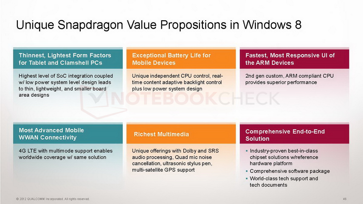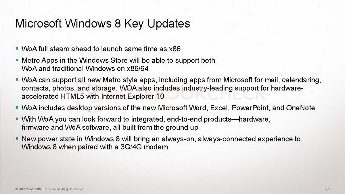Mit Microsoft arbeitet Qualcomm sehr eng zusammen, um für die eigenen Chipsätze eine maximale Kompatibilität mit Windows 8 sicherzustellen. Generell sieht Qualcomm im Hinblick auf "Windows on ARM" (WOA) für sich und seine Produkte, sehr gute Möglichkeiten, um sich auch hier positiv von der Konkurrenz abzugrenzen. Dank neuer Power-States wie "Always-on", "Always-connected" in Windows 8, ergeben sich für Mobile-Geräte mit integrierten 3G/4G-Chips von Qualcomm neue Anwendungsmöglichkeiten.