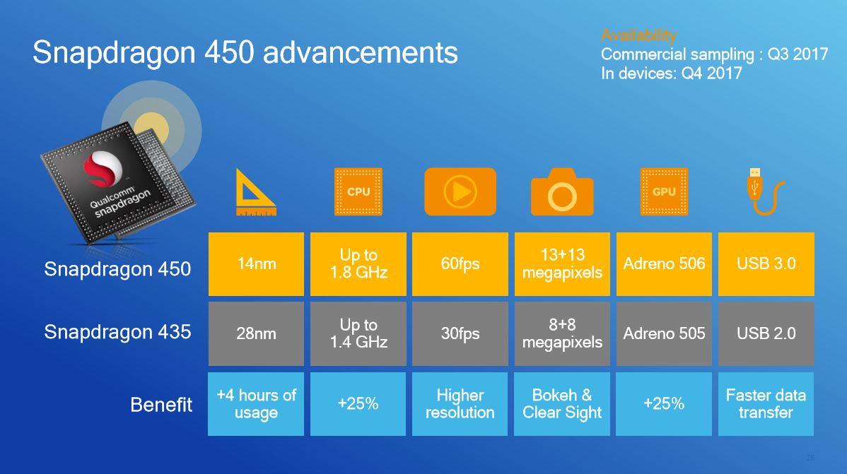 War der Snapdragon 435 noch ein 28 nm-Chip und hat entsprechend viel Energie verbraucht, beginnt mit dem Snapdragon 450 bald auch im unteren Midrange-Segment das Zeitalter des effizienteren 14 nm-Verfahrens. Qualcomm spricht von bis zu 4 Stunden mehr Akkulaufzeit bei ansonsten gleicher Hardware. Nach wie vor integriert die neue mobile Plattform acht Cortex A-53-Kerne, taktet diese aber nun mit bis zu 1,8 Ghz, eine Leistungssteigerung von knapp 25 Prozent. Das gilt analog für die Adreno 506-GPU, welche die Adreno 505 im Snapdragon 435 beerbt.