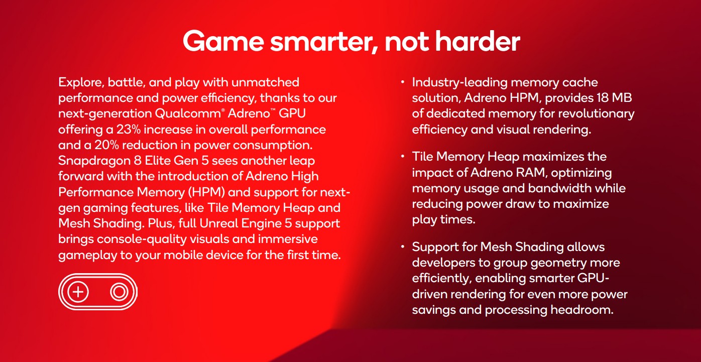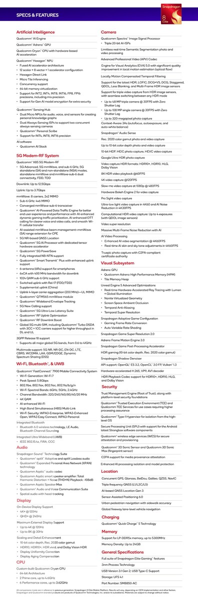 Wie beim Vorgänger kombiniert Qualcomm zwei Oryon Prime-Cores mit sechs Oryon Performance-Cores. Erstere laufen in der regulären Version des Chips mit maximal 4,6 Ghz, letztere mit bis zu 3,62 Ghz. Damit soll die Performance um 20 Prozent gegenüber dem Vorgänger steigen, während die CPU-Power-Effizienz sogar um bis zu 35 Prozent steigt - laut Qualcomm. Wie die erwähnten Benchmarks zeigen, sind die 20% sogar eher noch untertrieben. Als GPU ist eine neue Adreno verbaut, die sich in Geekbench als Adreno 840 outet. Gamer dürfen laut Qualcomm bis zu 23 Prozent höhere Performance erwarten, bei 20 Prozent reduziertem Energieverbrauch, Erstmals ist auch 18 MB dedizierter High-Performance-Speicher (HPM) verbaut, Support für Tile Memory Heap sowie Mesh Shading und Unreal Engine 5 soll Zockerherzen höher schlagen lassen.