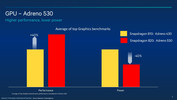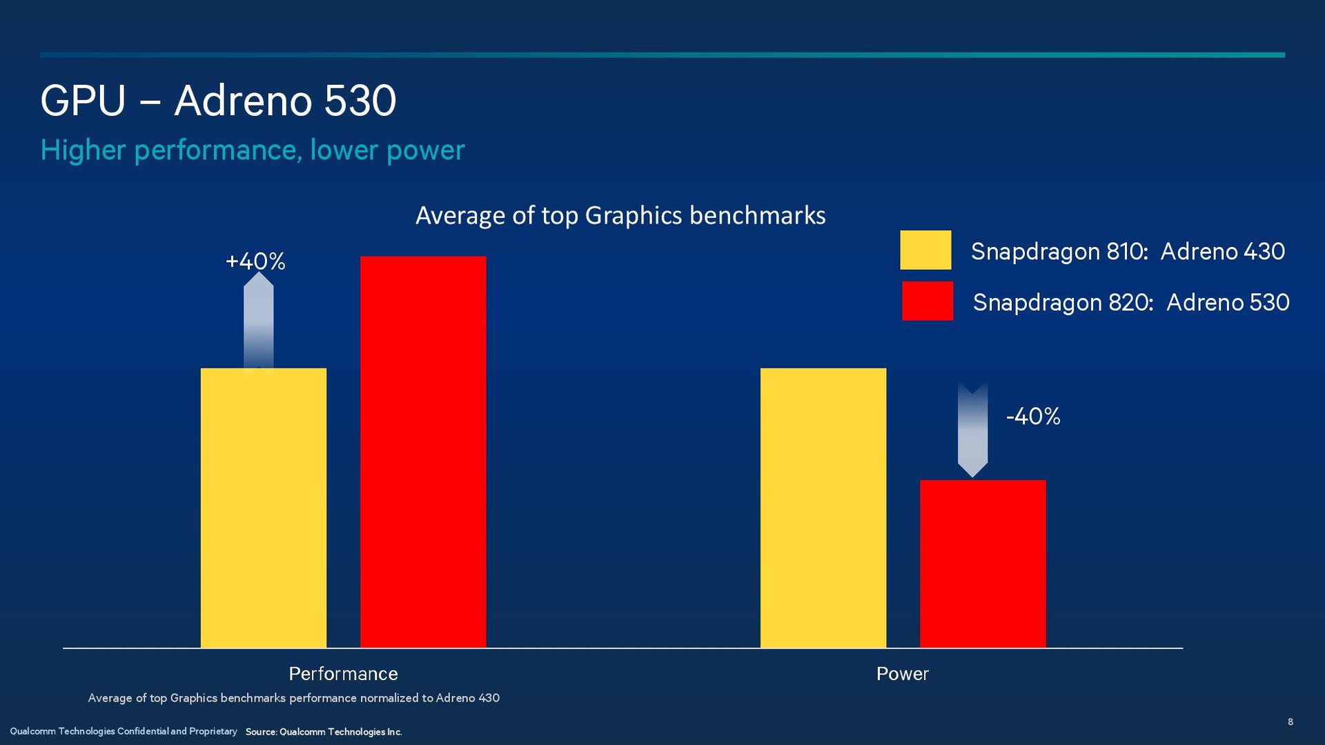 Dank überarbeiteter Architektur und modernerer 14-Nanometer-Fertigung verspricht der Hersteller einen beachtlichen Leistungszuwachs von 40 Prozent gegenüber der Adreno 430 (Snapdragon 810), womit die GPU nicht nur die Mali-T760 MP8 (Exynos 7420) überholen, sondern auch knapp an die PowerVR GXA6850 in Apples Tablet-Chip A8X herankommen würde. Darüber hinaus soll die Leistungsaufnahme, ebenfalls im Vergleich zur Adreno 430, um 40 Prozent zurückgehen, sodass künftige Endgeräte unter Last weniger throtteln müssten. Die gestiegene Grafik-Power lässt sich beispielsweise nutzen, um hochauflösende 4K-Displays mittels HDMI 2.0 (60 Hz) oder drahtlos per Wireless Display (30 Hz) anzusteuern.