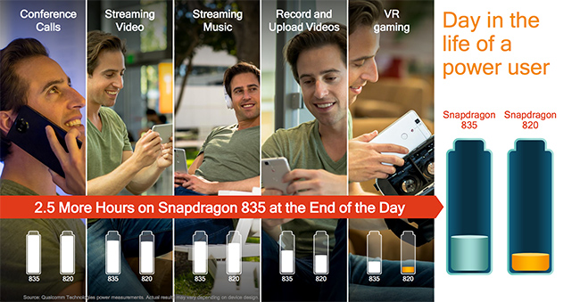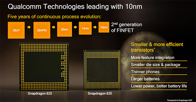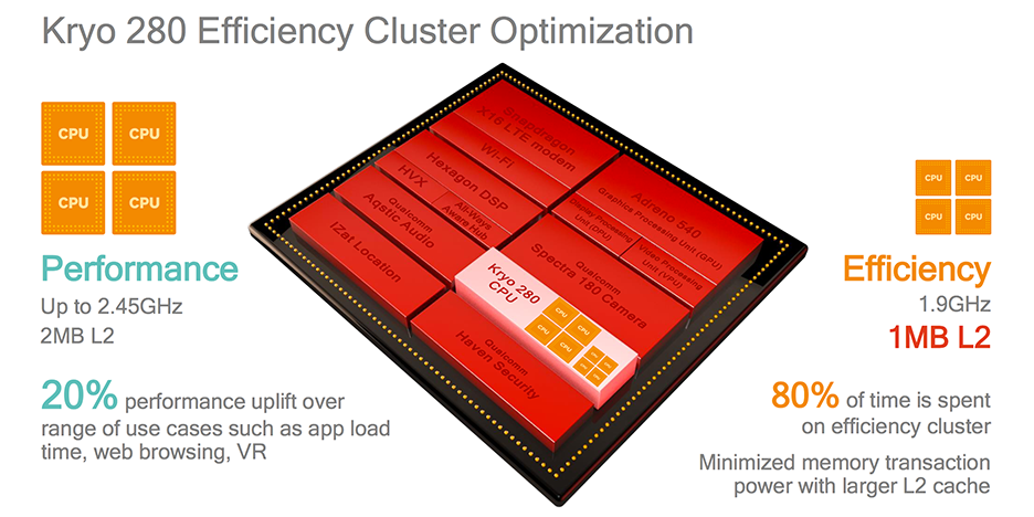 Das 10 nm-Verfahren soll den Snapdragon 835-SOC energiesparender und leistungsfähiger machen. Im Vergleich zum Vorgänger spart er 25 Prozent Energie und ist sogar 35 Prozent kleiner. Im Vergleich zum Snapdragon 801 aus dem Jahre 2014 wird sogar nur die Hälfte an Strom verbraucht. Das sollte im Jahr 2017 noch kleinere, dünnere und dennoch länger laufende Mobilgeräte ermöglichen. Dennoch ist die Leistungsfähigkeit gestiegen. Mit einem Octa-Core aus leistungsfähigen Kryo 280 Kernen, einer Weiterentwicklung der vier Kryo-Kerne im Snapdragon 820, bietet er zwei Quad-Core Cluster, einer arbeitet mit energiesparenden 1,9 Ghz, die anderen vier Kerne mit schnellen 2,45 Ghz.