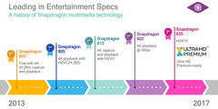 - Adreno 520 GPU mit 25 Prozent höherer Geschwindigkeit beim 3D-Rendering sowie 60 mal mehr möglichen Farben als beim Snapdragon 820. Support für OpenGL ES 3.2, OpenCL 2.0, Vulkan und DX12 sowie Unterstützung für 4K Ultra HD video capture @ 30 fps, bis zu 4K Ultra HD video playback @ 60 fps und H.264 (AVC) sowie H.265 (HEVC). Maximal 4K-Displays (intern und extern) werden mit 60 fps und 10 bit Color sowie erweitertem Farbraum unterstützt.