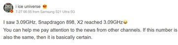 Das suggerieren zumindest einige Tweets und Weibo-Postings zweier bekannter Industrie-Insider beziehungsweise Leaker (siehe unten), die dieser Tage mit Hinweisen auf den Nachfolger des Snapdragon 888+ auf sich aufmerksam machen. Der Cortex X2 im möglicherweise Snapdragon 898 oder Snapdragon 895 benannten Qualcomm-Flaggschiff-SoC für 2022 soll mit 3,09 Gigahertz noch höher takten als je zuvor und laut Digital Chat Station genauso viel Hitze produzieren wie die aktuelle Mobilplattform, was nicht gerade viel Effizienz-Optimierung des 4nm-Verfahrens erwarten lässt.